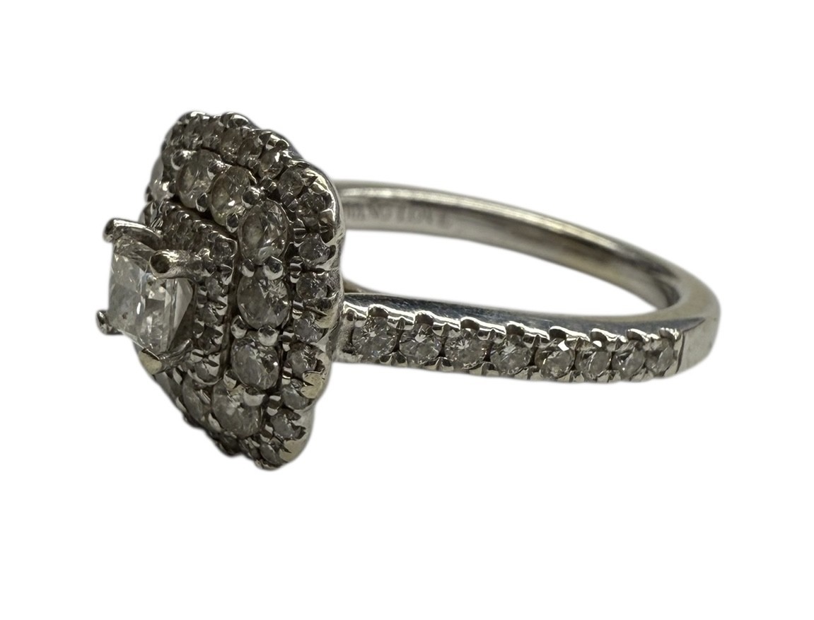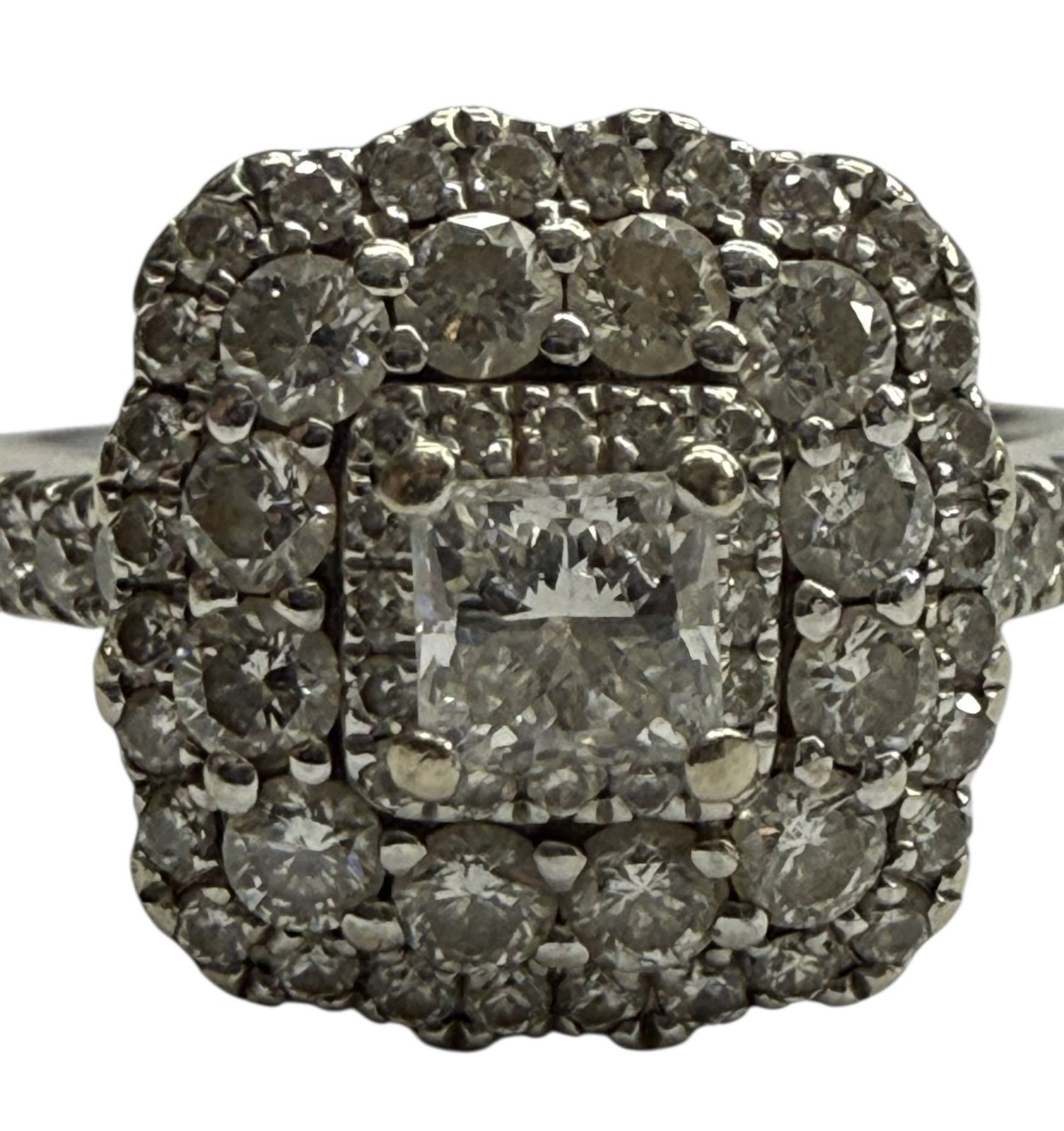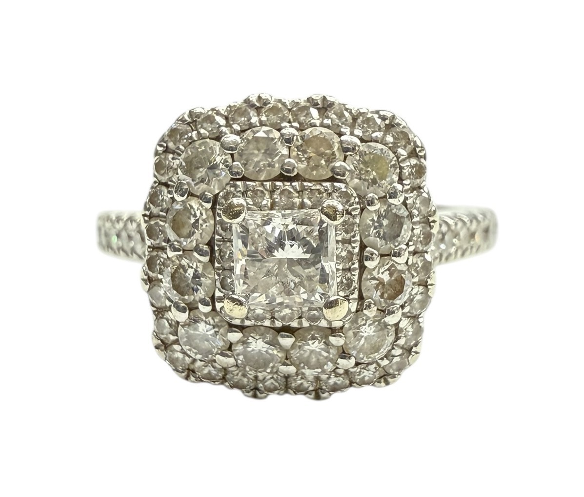 Type: Cluster ringWeight: 3.6Karat: 14ktMetal: White GoldGender: Women'sStyle: ClusterBrand: Vera WangSize / Length: 6.75Owner applied: 14kt VERA WANG LOVEStone 1 quantity: 1Stone 1 shape: PrincessStone 1 color: ClearStone 1 weight (total): .30Stone 1 type: DiamondStone 2 Quantity: 55Stone 2 Shape: RoundStone 2 Color: ClearStone 2 Weight (Total): 1.22Stone 2 Type: DiamondCondition:Used