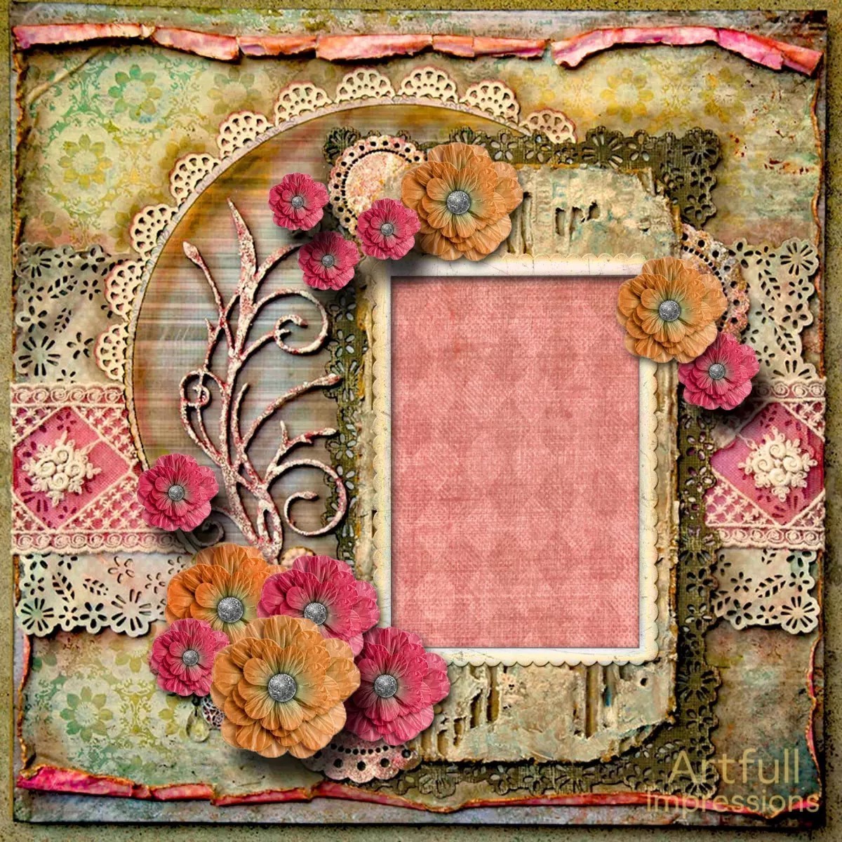 and apricot paper flowers, all anchored by a central frame in soft rose.