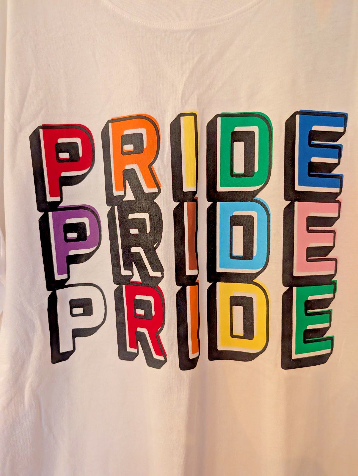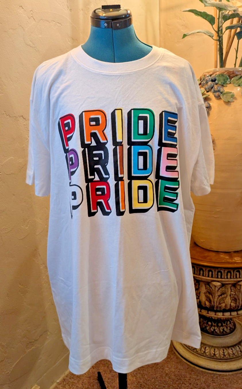 This men's white pride t-shirt in size XL is a solid, short sleeve shirt made from cotton knit fabric. The crew neckline and regular fit make it comfortable for all seasons, while the pride theme adds a bold statement. Machine washable and featuring the brand PRIDE, this t-shirt is perfect for showcasing your support during the summer and spring seasons. Made in Nicaragua, this shirt is a stylish and inclusive addition to any wardrobe.