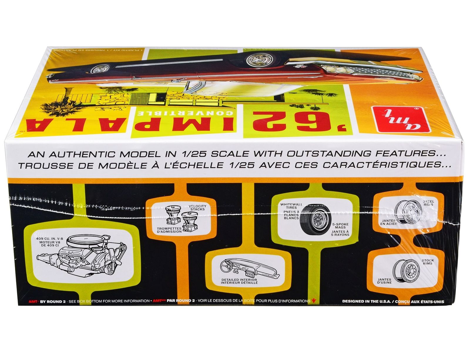 Officially licensed product capturing authentic design 1/25 scale model kit for a detailed and impressive build Contains 123 detailed parts, including chrome-plated small parts Includes black vinyl tires with metal axles and white wall tires Features a powerful 409 cu. in. V-8 engine and colorful decal artwork