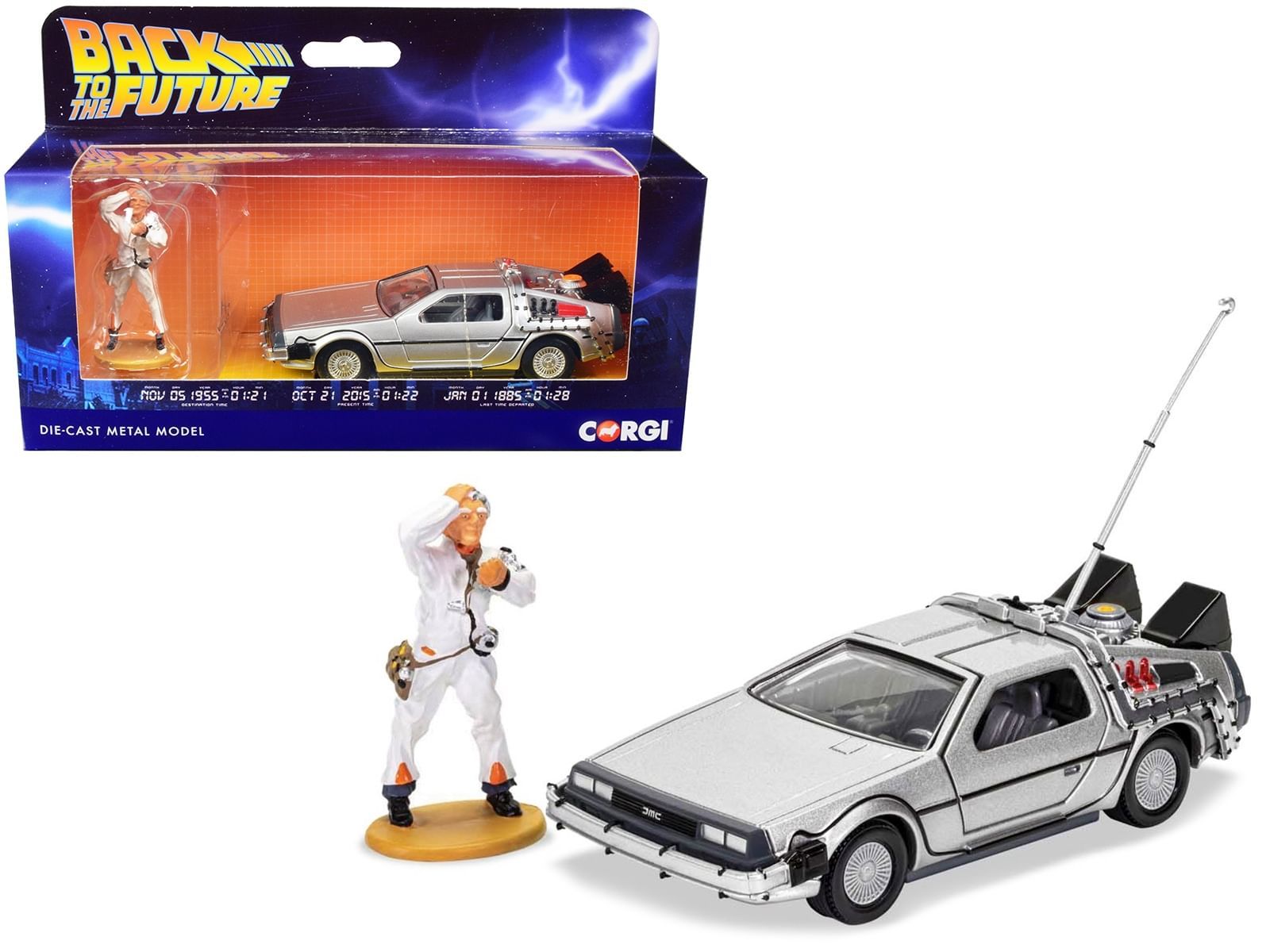 Officially licensed by Universal Studios for authenticity and quality. Limited edition release - own a piece of movie history before it's gone! Opening gull-wing doors for realistic play and display. Detailed exterior and interior with iconic "OUTATIME" registration plate. Includes a collectible Doc Brown figure, standing approximately 2.25 inches tall. Made from diecast metal with some plastic parts for durability and detail.