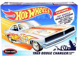 Brand new 1/25 scale plastic model kit of 1969 Dodge Charger Funny Car "Hot Wheels" (Skill 2) 1/25 plastic model kit by Polar Lights. Brand new box. Black vinyl tires. Detailed suspension. Supercharged engine. Multiple wheel options. Colorful decal artwork. Vintage style packaging. Officially licensed product. Chrome plated small parts. Tubular frame and roll cage. More than 138 detailed parts. "Hot Wheels" decals or stickers. Redline pad-printed vinyl tires and belt. Paint and cement required (not included). "Chrome" trim detail can be striped on with silver paint. Parts molded in SILVER METALLIC, unless otherwise indicated.
