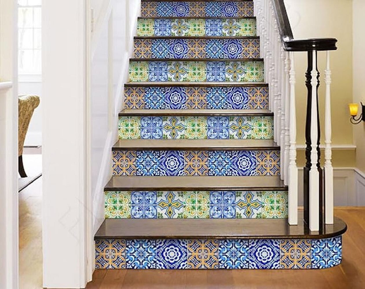 You can transform your kitchen backsplash into a tropical paradise with sunny yellow and turquoise waves. Or maybe you crave a modern touch for your staircase - these tiles offer a sleek geometric pattern to elevate your home. You can create an enchanting bathroom mosaic or even personalize your living room wall with intricate patterns - the sky's the limit!
