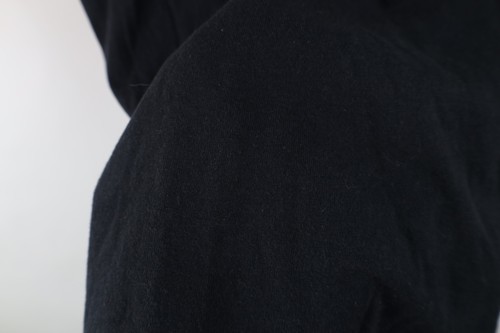 Blemishes/dark spots front, back. Collar discolored. Graphics, color faded. Pilling