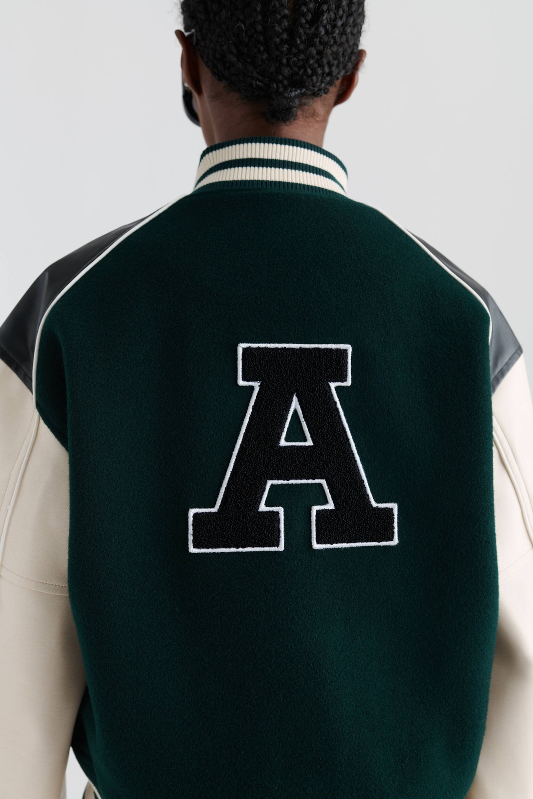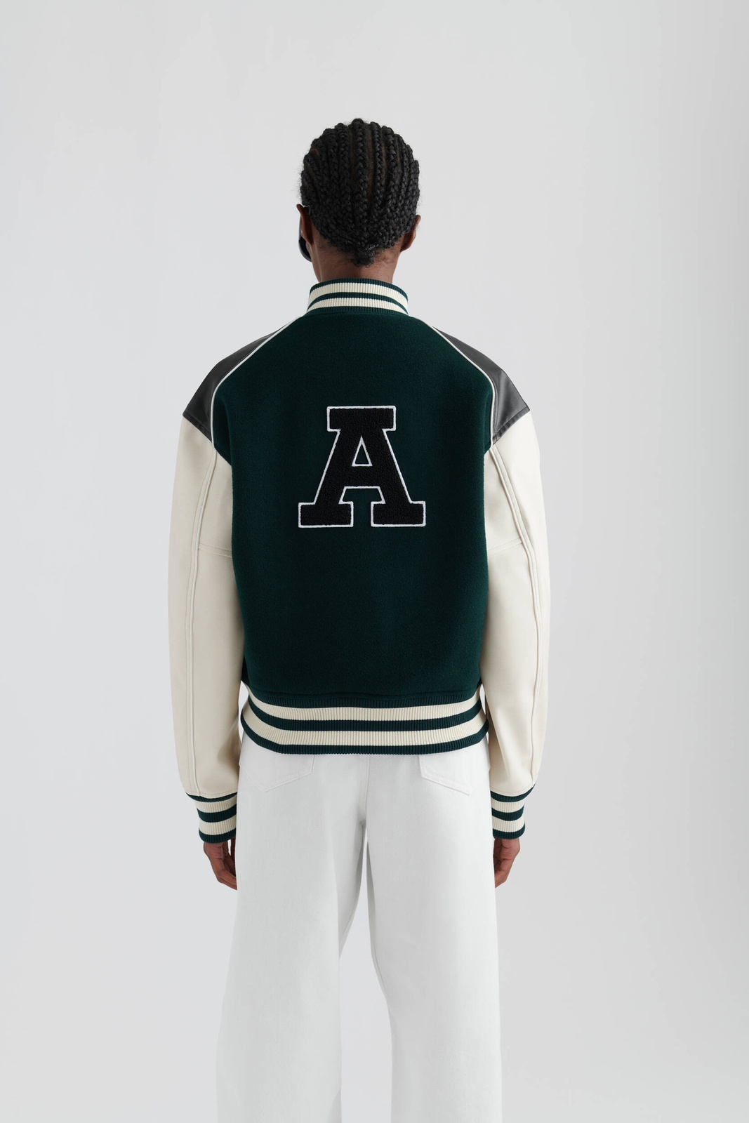Green and White Varsity Letterman Jacket – Cropped Bomber Style with "A" Patch