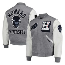 Show your Bison pride with this officially licensed Howard University varsity jacket. This premium letterman-style jacket features a sleek grey wool-blend body with contrasting white faux leather sleeves. Bold embroidered patches on the front and back include the fierce Bison mascot, a large “H” emblem with red stars, and “Howard University” lettering – making it a standout tribute to one of the most prestigious HBCUs.