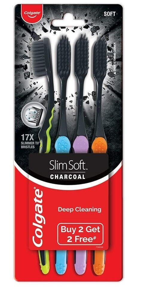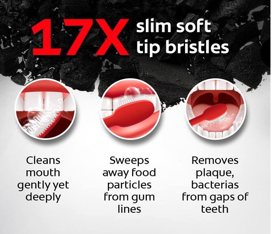 Colgate Slim Soft Charcoal has 17x Slimmer Tip Bristles (vs ordinary end rounded bristles) specially designed to sweep away food and plaque from along gum line and Narrow gaps between teeth