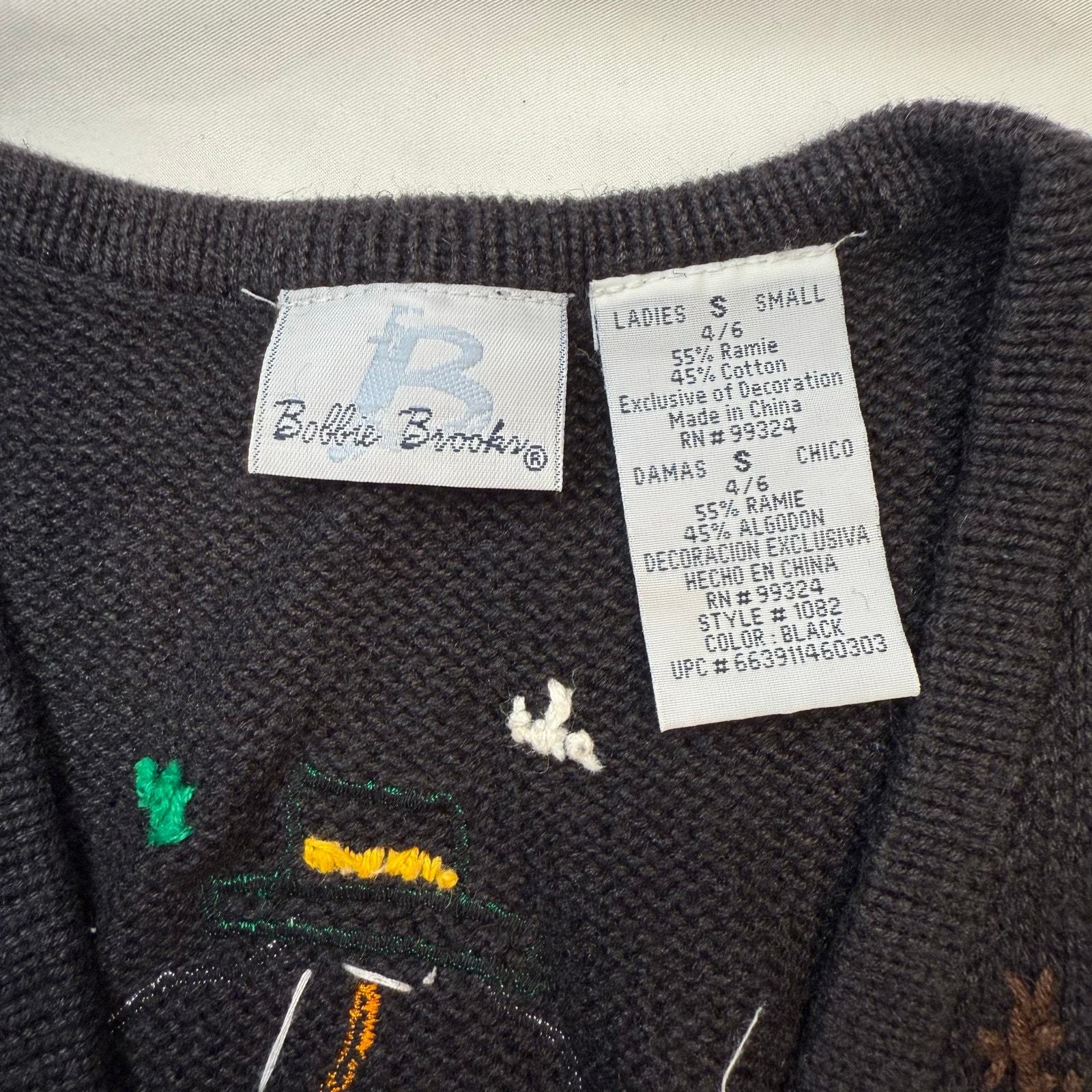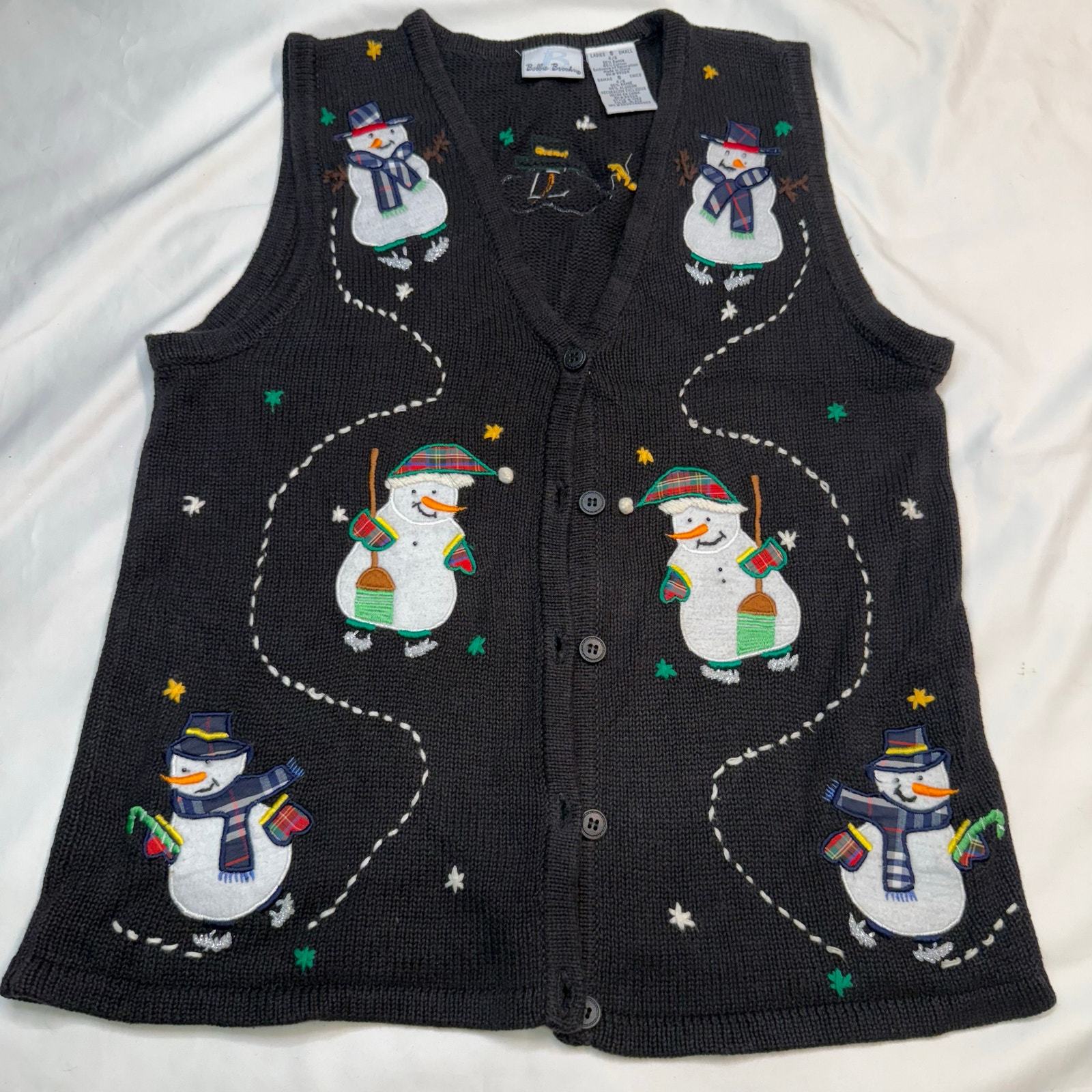 Get festive this holiday season with this charming vintage sweater vest by Bobbie Brooks. Features an all-over embroidered snowman design complete with plaid accents, scarves, brooms, and candy canes on a black knit background. The back of the vest showcases a melted snowman with a whimsical touch. Perfect for ugly sweater parties, Christmas events, or cozy seasonal wear!