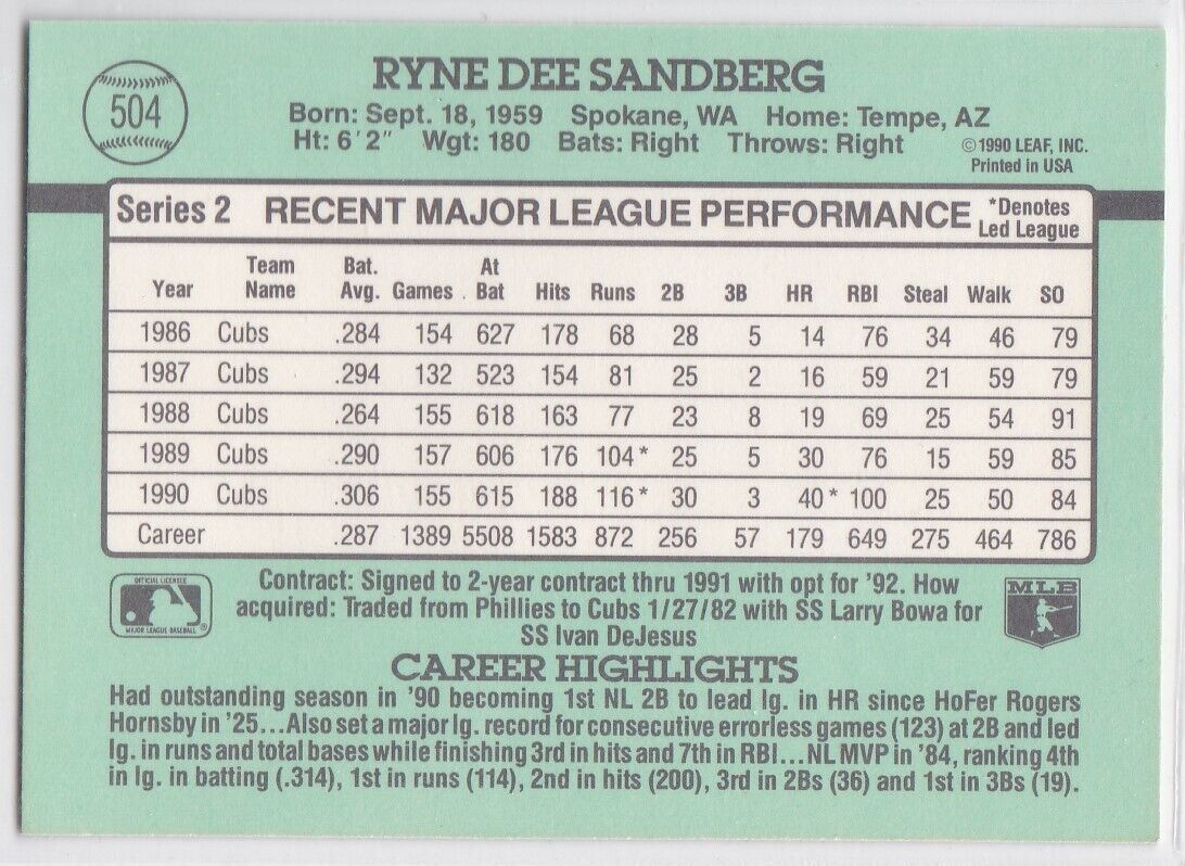 M) 1991 Donruss Baseball Trading Card - Ryne Sandberg #504