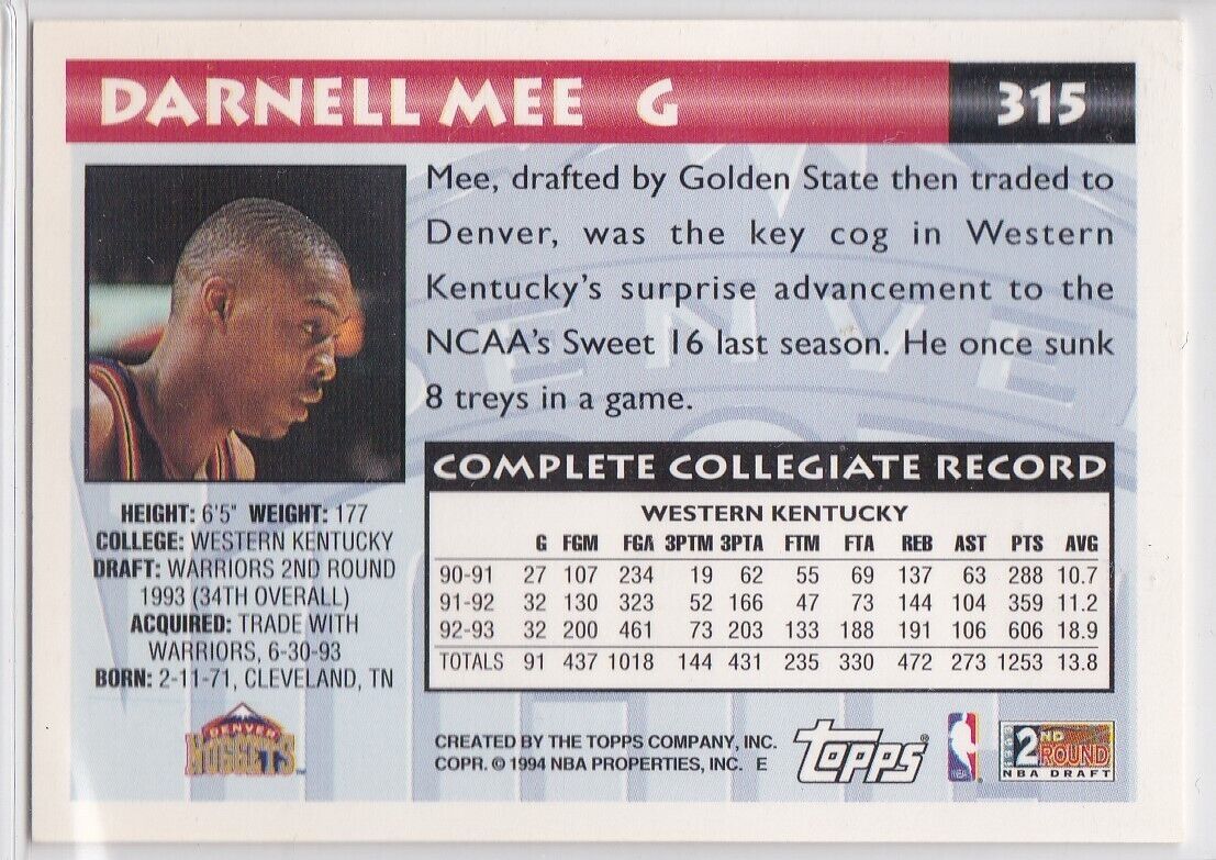 M) 1993-94 Topps Basketball Trading Card - Darnell Mee #315