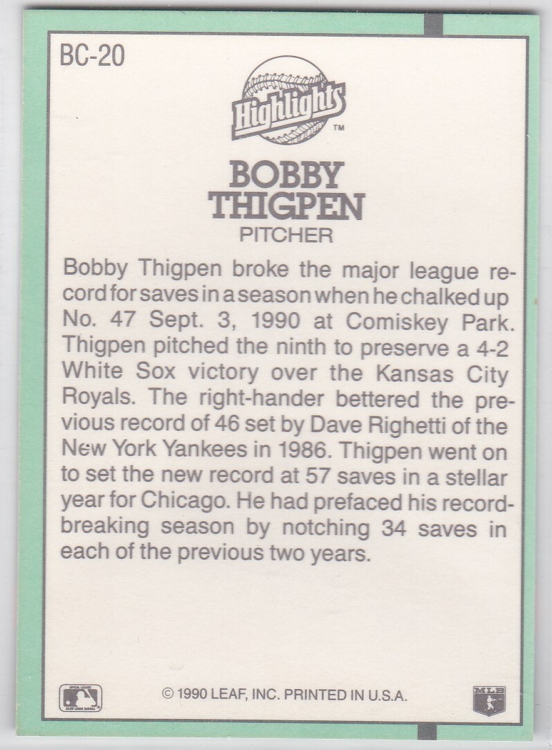 M) 1991 Donruss Baseball Trading Card - Bobby Thigpen BC-20