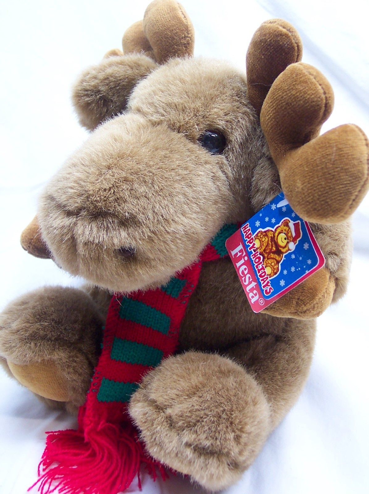 This is a VINTAGE MOOSE WITH RED GREEN SCARF Plush Stuffed Animal. Made by Fiesta in 1996. It is 8 inches tall. It is NEW with the tag but tag has names written on the inside. It is CLEAN. There are No Stains, Tears or Defects. Combine auctions to save on shipping. Please contact me if you need to make other payment arrangements. EAG