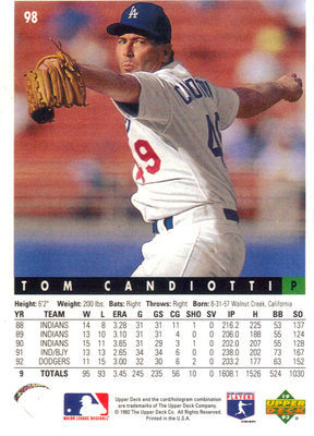 1993 Upper Deck MLB Baseball Trading Card - Tom Candiotti - #98 LA Dodgers ERROR