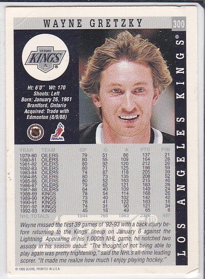 G) 1993-94 Score Hockey Trading Card - Wayne Gretzky #300