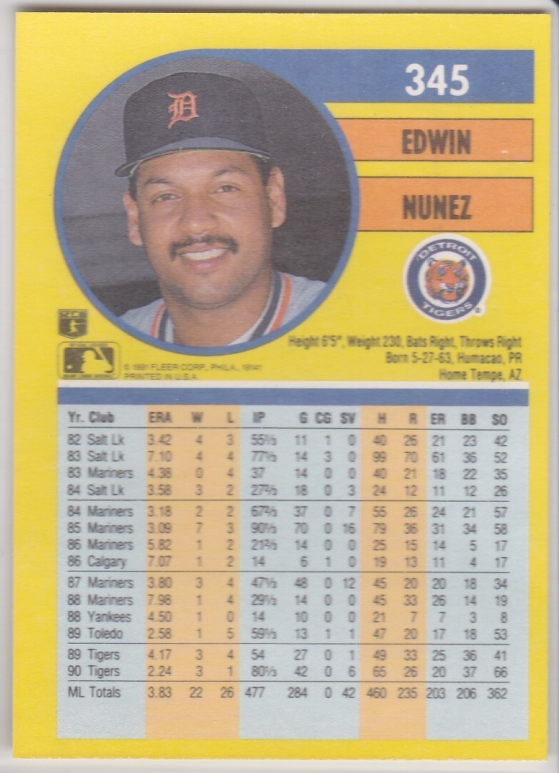 M) 1991 Fleer Baseball Trading Card - Edwin Nunez #345