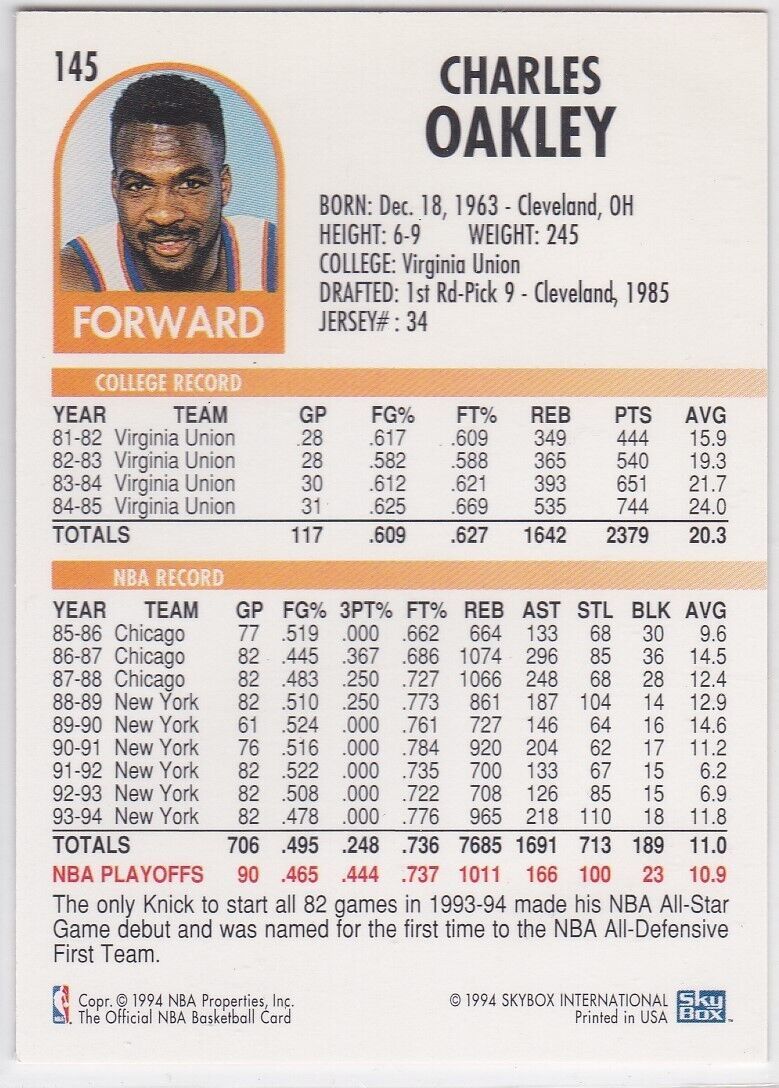 M) 1994 NBA Hoops Skybox Basketball Trading Card Charles Oakley #145