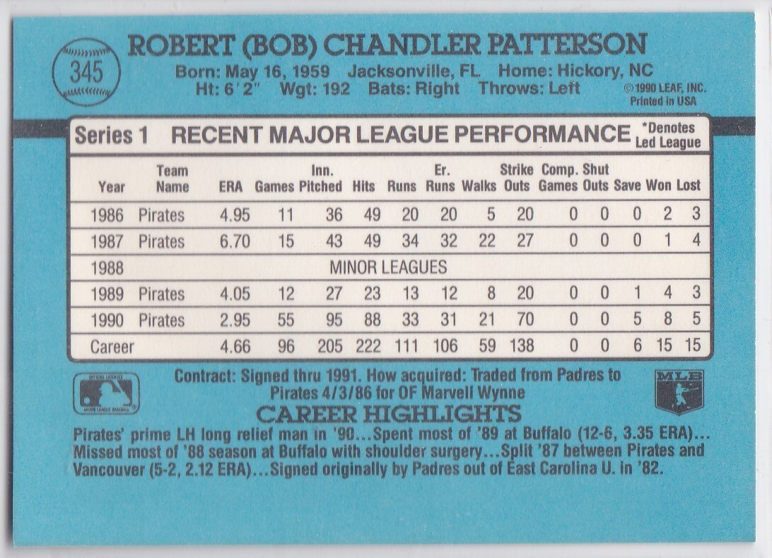 M) 1991 Donruss Baseball Trading Card - Bob Patterson #345