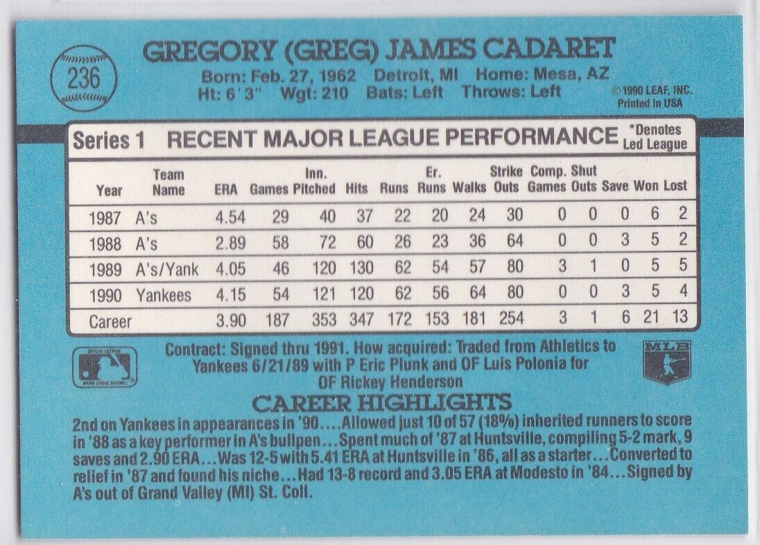 M) 1991 Donruss Baseball Trading Card - Greg Cadaret #236