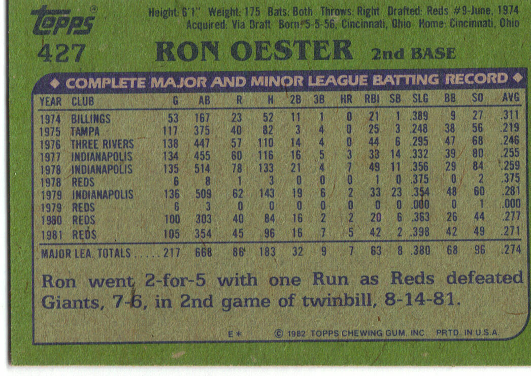 1982 Topps Ron Oester Cincinnati Reds #427 Baseball Trading Card