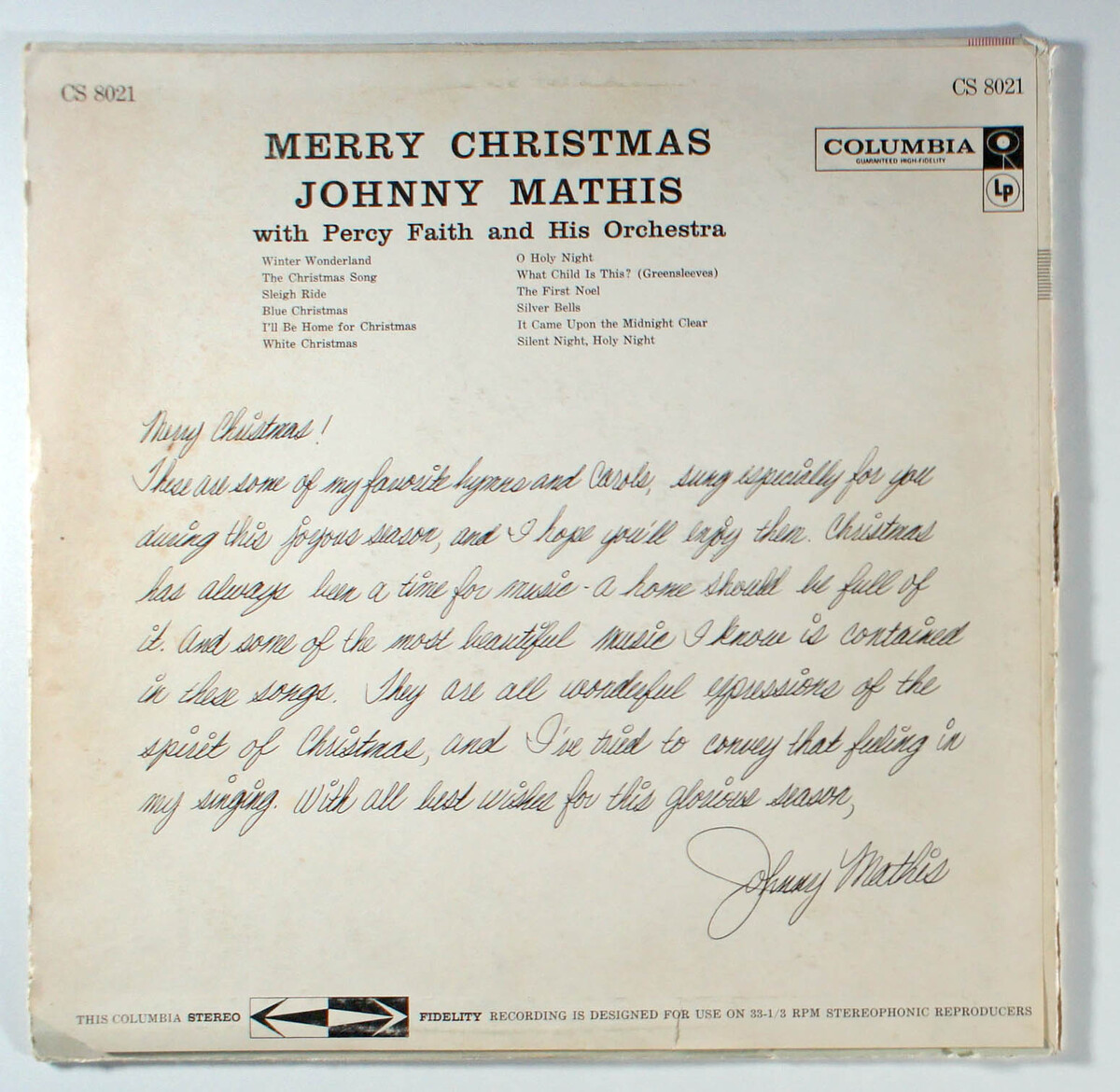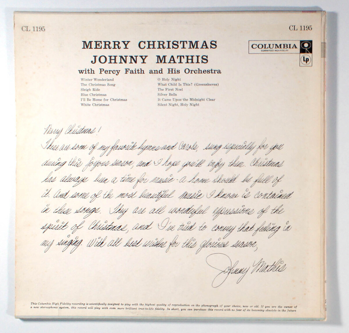 Merry Christmas is the first Christmas album by American pop singer Johnny Mathis, with Percy Faith and his orchestra. The selections are a mix of traditional Christmas carols (Silent Night, O Holy Night, The First Noel) and holiday hits (The Christmas Song, White Christmas, Silver Bells). In 2013 it ranked as one of the top selling Christmas albums of all time with five million copies sold. The original album was initially released in the monaural format but became available in stereo in 1959.
