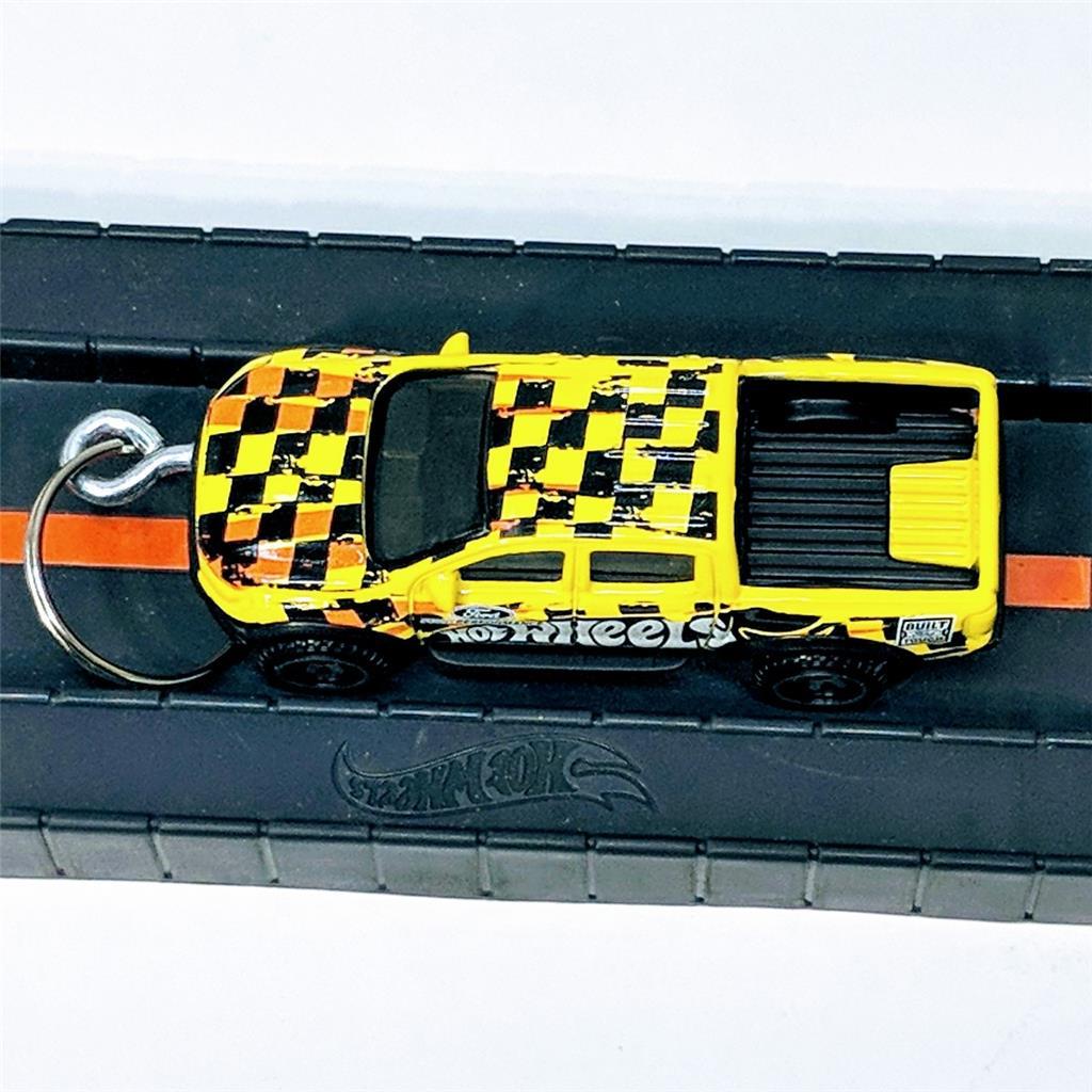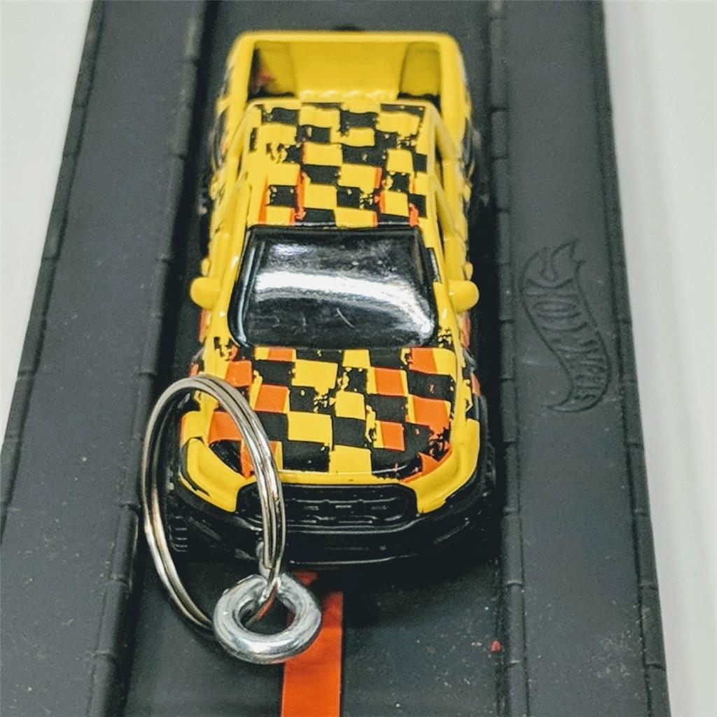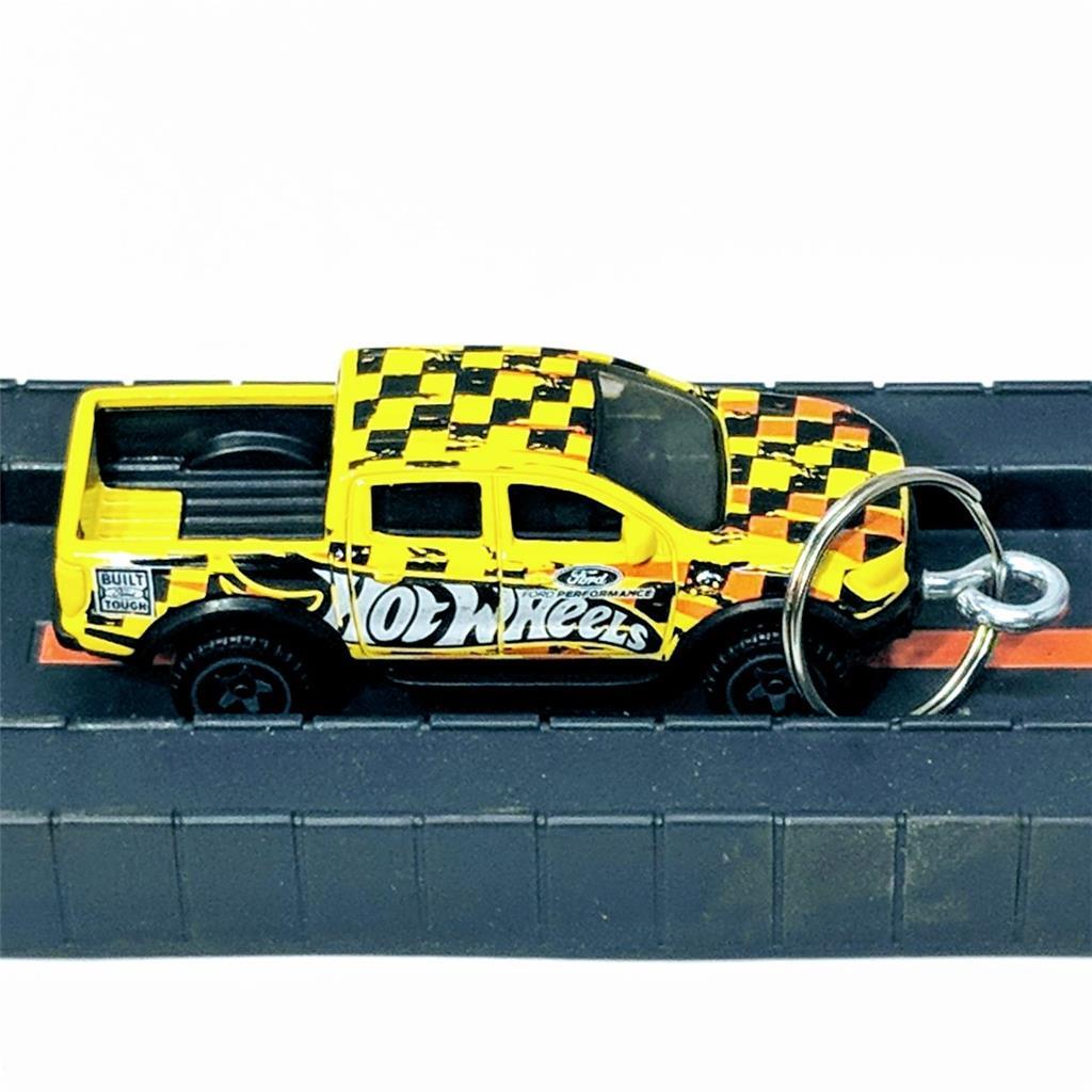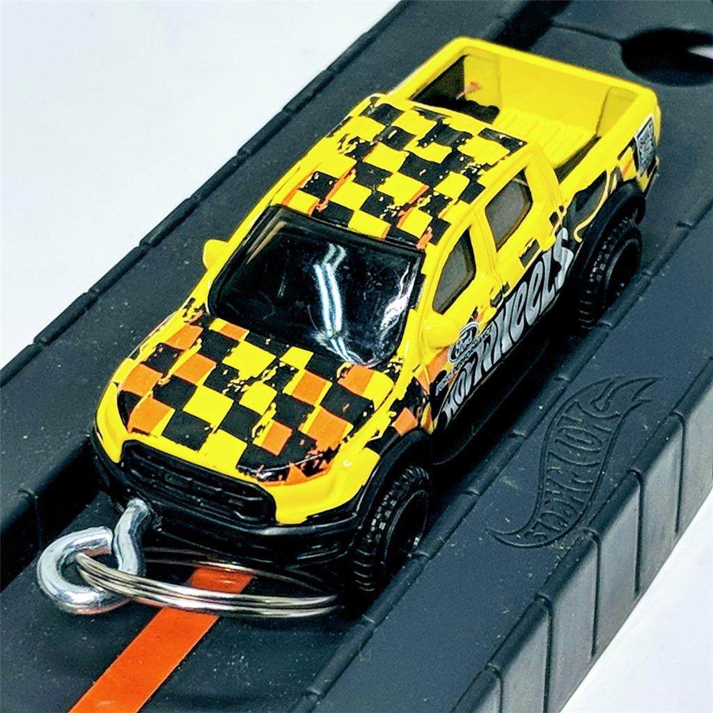 This Hot Wheels diecast keychain features the coveted 2019 Ford Raptor pickup truck in a vibrant yellow color. The scale is 1:64 and it's part of the Hot Wheels Hot Trucks series. This customized model includes a keychain and is recommended for ages 16 and up.