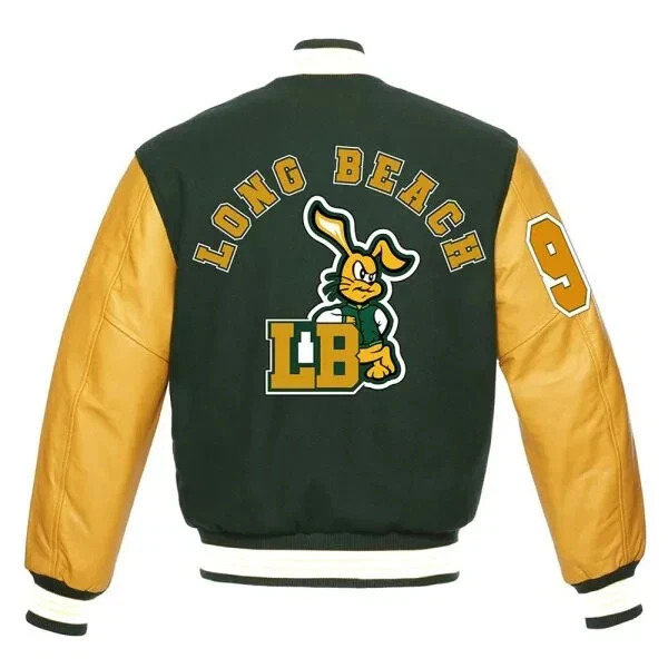 DSHARKS Long Beach Green Wool Yellow Genuine Leather Sleeves Varsity Jacket