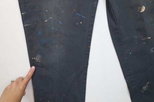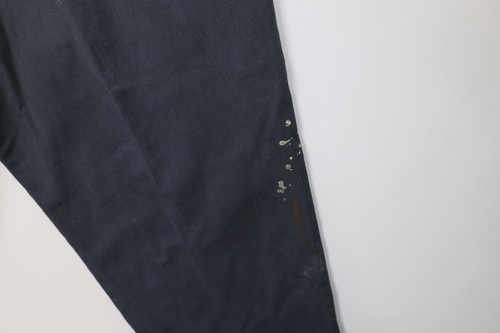 Hole bottom left leg. Paint stains front and back. Distressed and faded