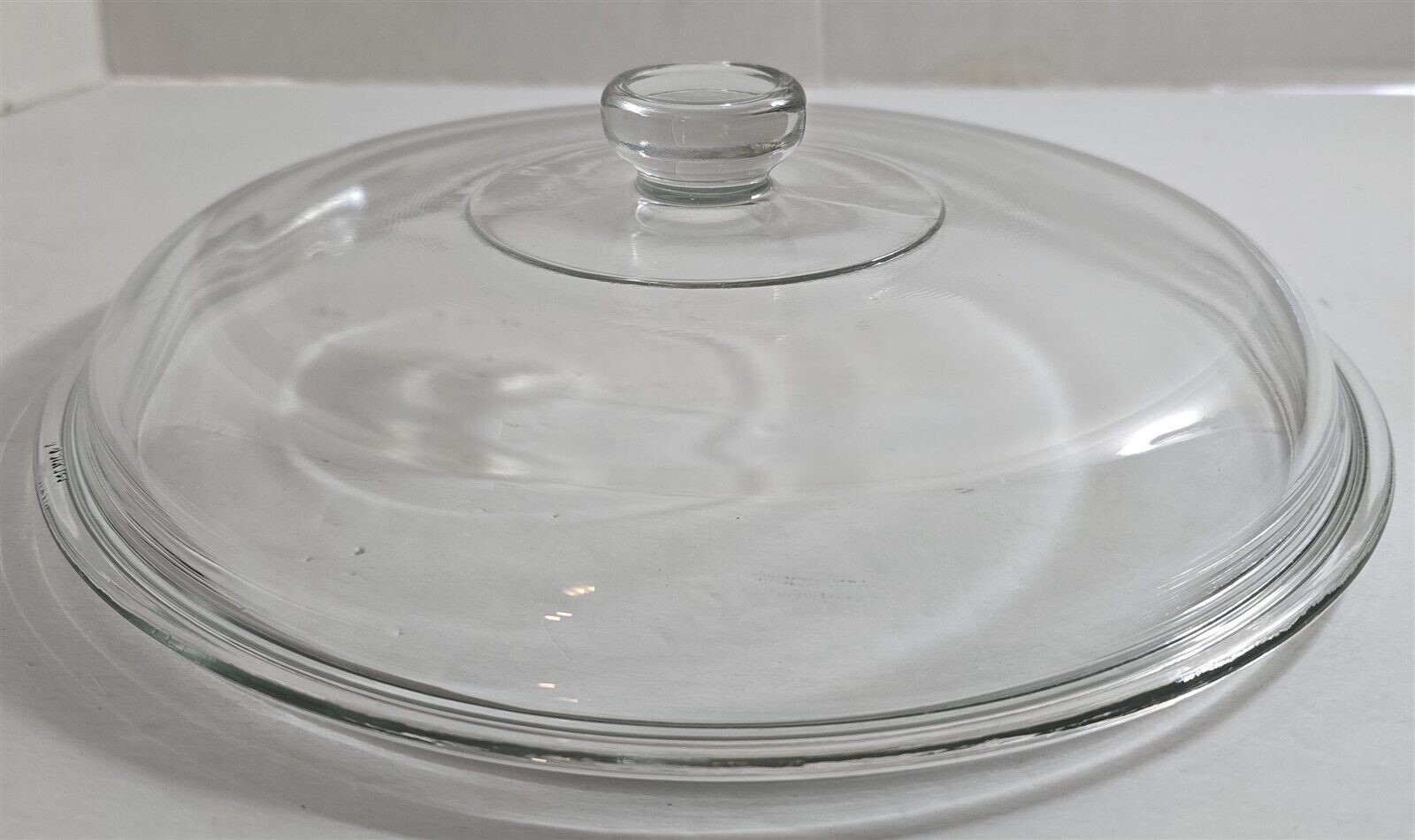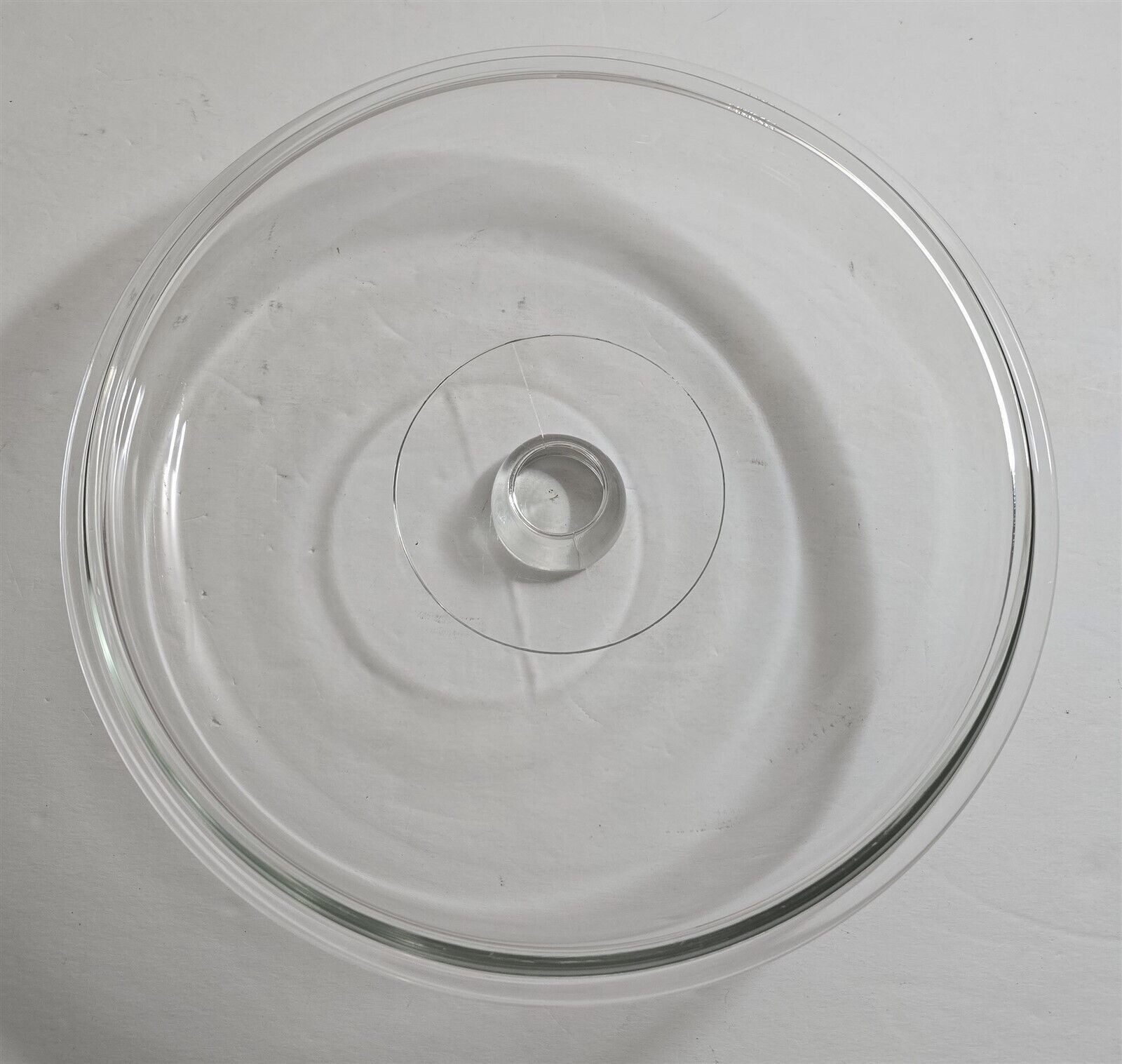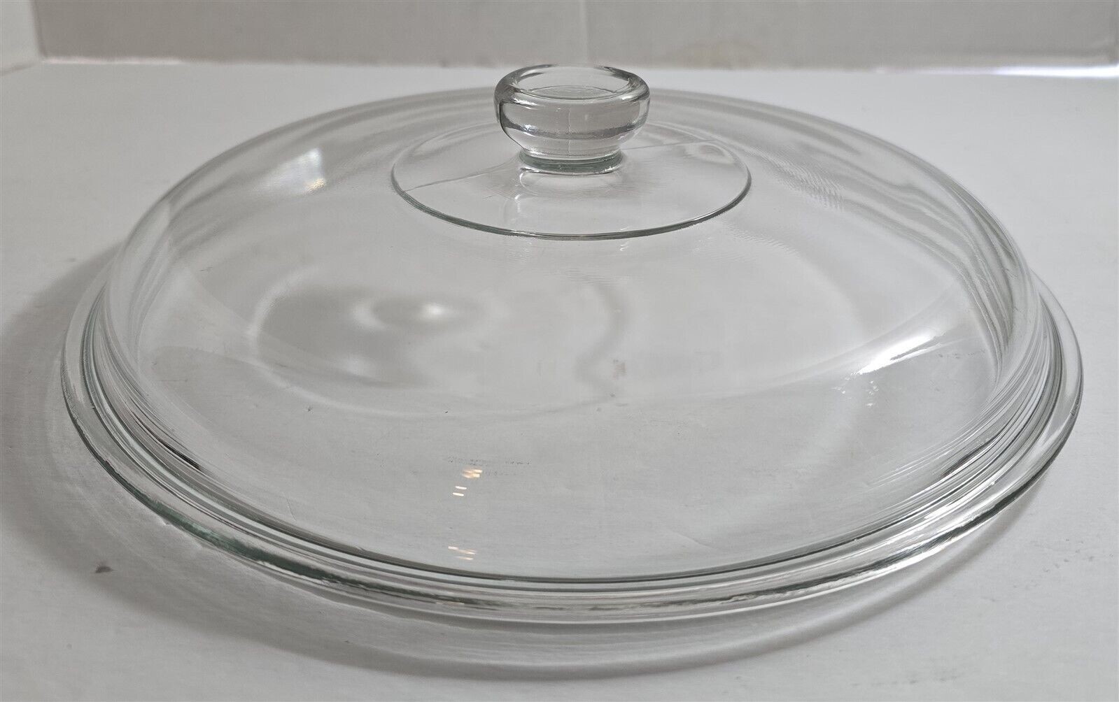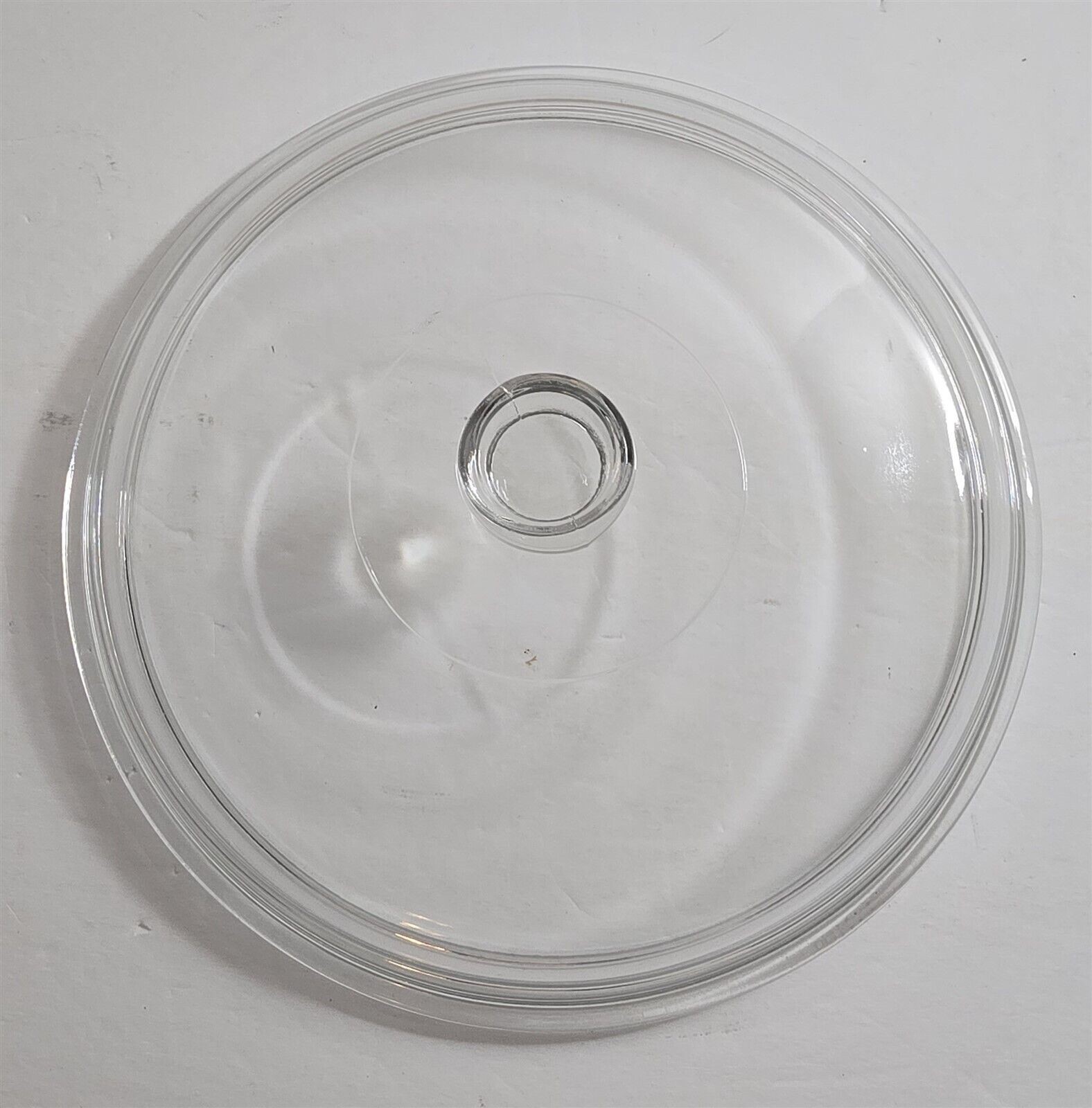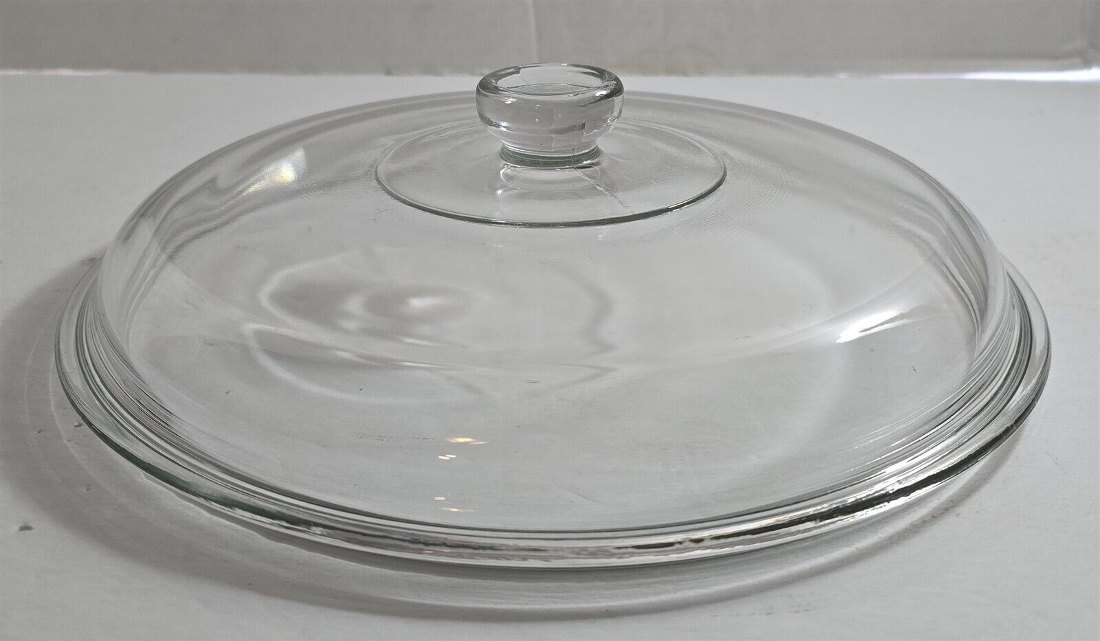 This sale is for a vintage replacement lid, clear glass, good to excellent condition, no cracks, no chips, no crazing, came out of a box in the barn, dirty and needs to be cleaned, measures approximately 9 1/2" outside diameter x 8 3/4" inside lip diameter, from a smoke free home.