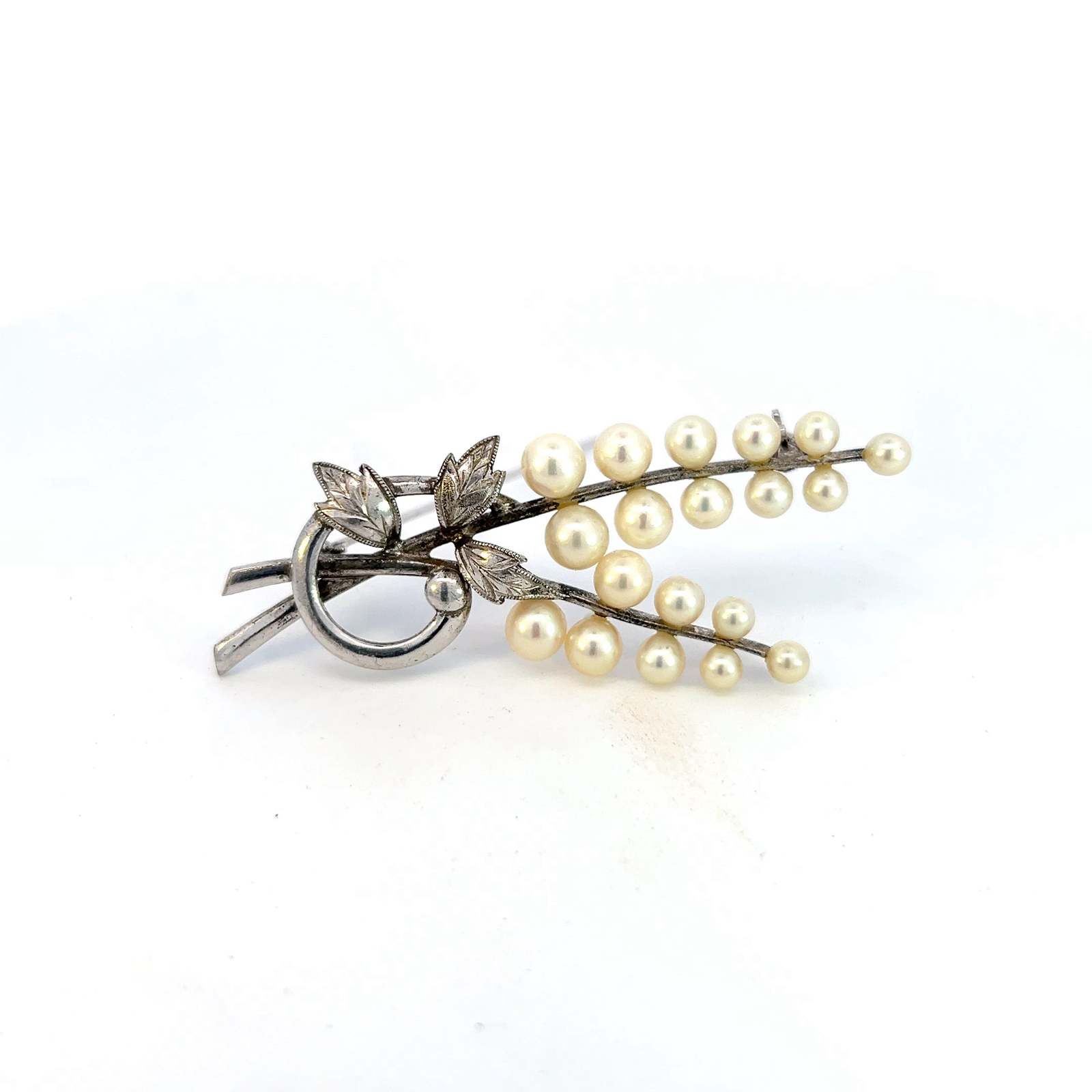This elegant Authentic Mikimoto Silver brooch has 19 Saltwater Akoya Cultured Pearls.