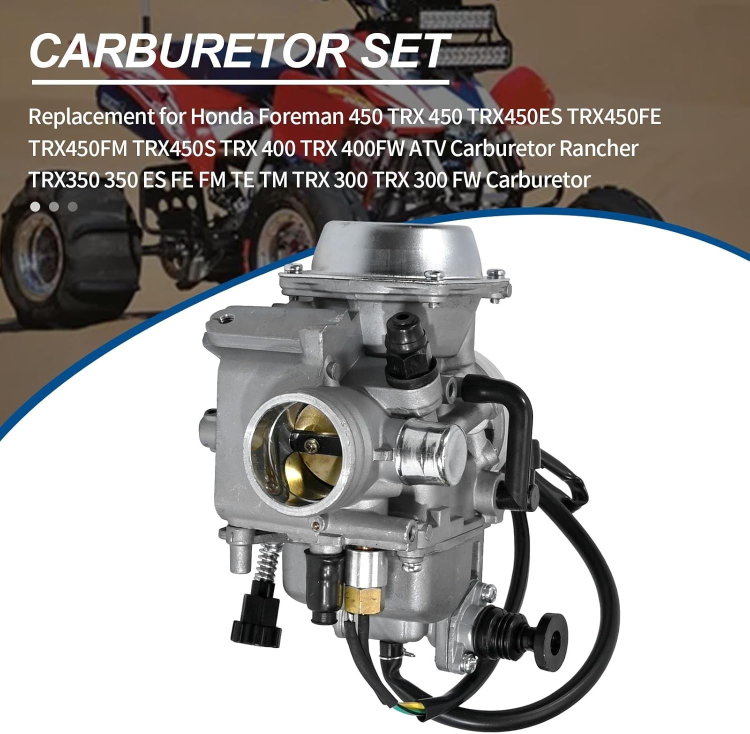 [Replace Part Number]: 16100-HN5-M41, 16100-HA0-305, 16100-HM3-L01, 16100-HM5-L01, 16100-HN0-A02. [Fitment]: Replacement for Honda Foreman 450 TRX450F(2002-2004), TRX450FM (2002-2004), TRX450ES (1998-2001), TRX450S (1998-2001). [Fitment]: Replacement for Honda Rancher TRX350FE FM TE TM ES (2000-2006) [Package Includes]: 1 x carburetor, 1 x black throttle base cover, 1 x throttle base cover screw, 1 x throttle cable, 1 x fuel filter. [Note]: Please check the details and product description before purchasing to make sure the part is suitable.