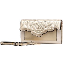 This luxurious clutch combines elegance with a modern twist, featuring a gold-tone rose-patterned quilted design. Its sleek, metallic finish is adorned with shimmering rhinestones, making it a sophisticated choice for evening events. The versatile detachable strap offers convenience for both handheld and shoulder carry. Elegant rose-quilted pattern for a chic, feminine look. Shimmering gold-tone metallic finish with crystal embellishments. Detachable shoulder strap for versatility. Ideal for formal occasions or a stylish night out. Enhance your evening with this stunning accessory that perfectly balances timeless charm with contemporary style. A must-have for those who appreciate luxury and craftsmanship.