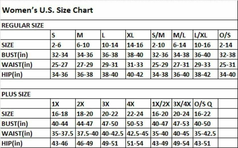 Sizing Info: One Size Size: 2-12 Bust: 32"-38" Hips: 34"-38"