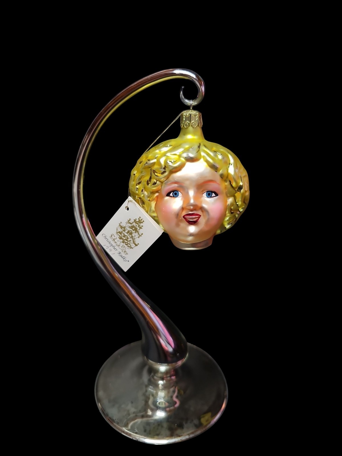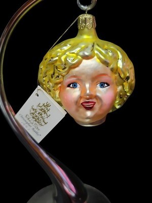 Christopher Radko?s 1991 Shirley Temple ornament, style 91-015-0. Hand-blown and hand-painted in Poland, this glass ornament features Shirley?s iconic blonde curls and rosy cheeks. Includes the original Radko hang tag. Excellent vintage condition with light wear from age. A true must-have for Radko or Hollywood memorabilia collectors.