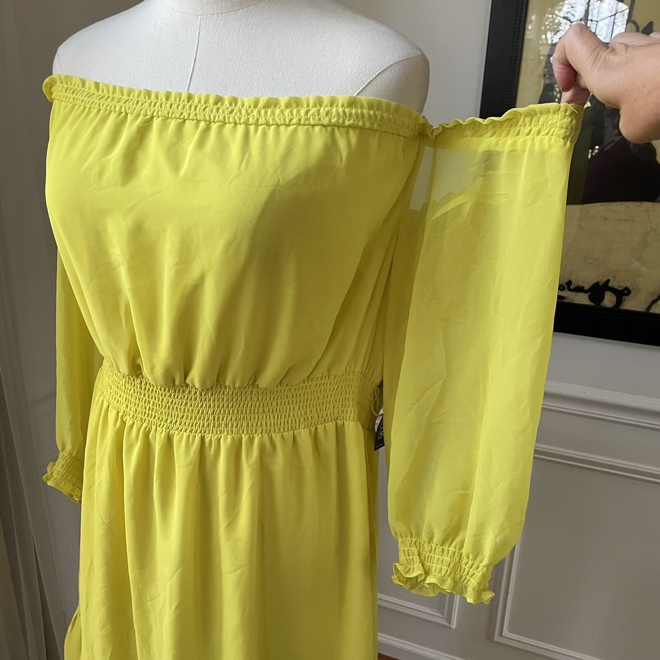 New with tags, New York and company long sleeve off shoulder peasant dress in bright, sunny yellow with ruffle around the ham. Lightweight polyester chiffon. Lined. Laying flat measures approximately 31 inches from top to bottom, 16 inches straight across the elastic waist unstretched and 20 inches from armpit to armpit