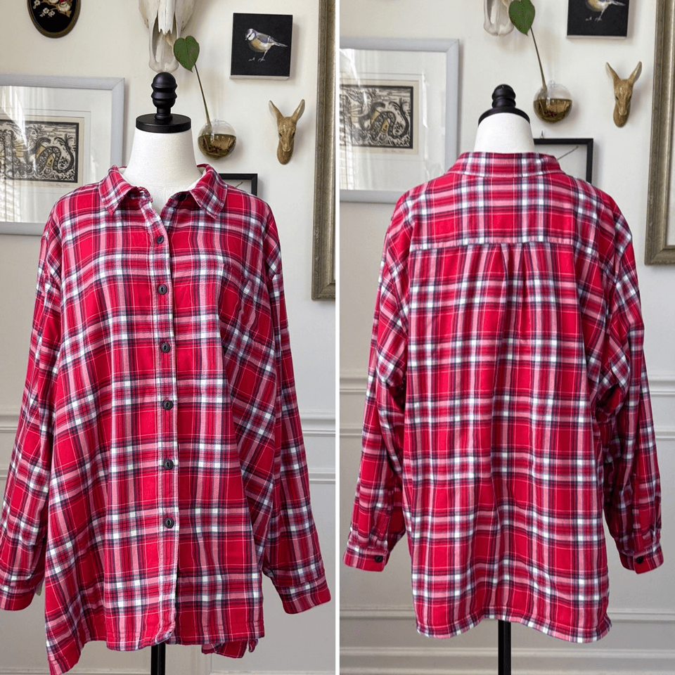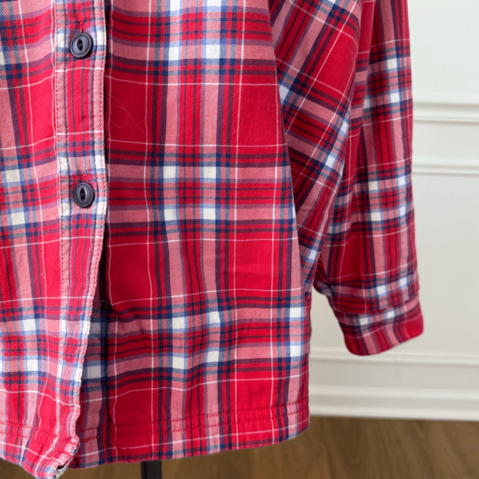 Women?s L.L. Bean, red and dark blue plaid 100% cotton button up flannel lined with 100% polyester fleece. Spare button on the inside tag. Notched hip for easy movement. $90 retail. Laying flat measures 31 inches shoulder to hem and 30 inches armpit to armpit.
