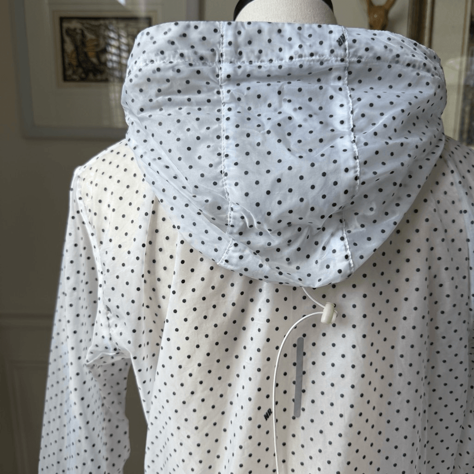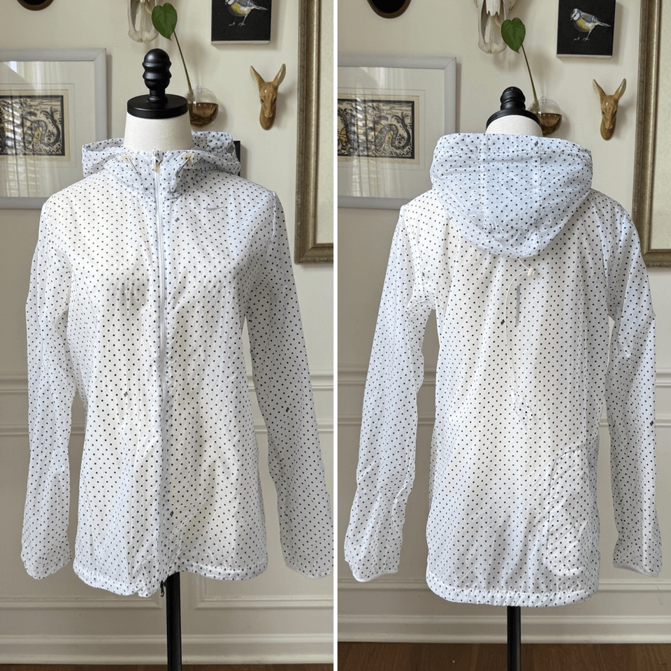 Nike Run Women Vapor Cyclone Blabk White Polkadots Running Jacket. Adjustable Hood. No front pockets but there is a back hip zipper pocket, including a medium port hole.