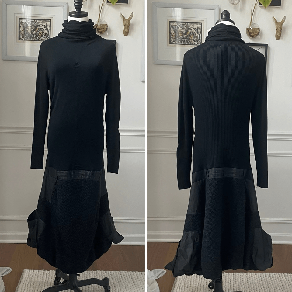 Vintage Style black steam punk or lagenlook long sleeve turtleneck knit dress with drop waist and bubble skirt. This is not style New York, the modern brand. This is Style, which was a division of Cache brand. The drop waist turtleneck top is stretchy knit before falling to a bubble skirt with mixed textures and material, including two pockets near the hem. it is a cotton and polyester blend. Tag size large. Laying flat measures 46 inches shoulder to hand, 18 inches on pit to armpit and 16 inches straight across the waist. There is gentle ruching and ribbing at the sides for a little additional stretch, but the knit is stretchy to begin with