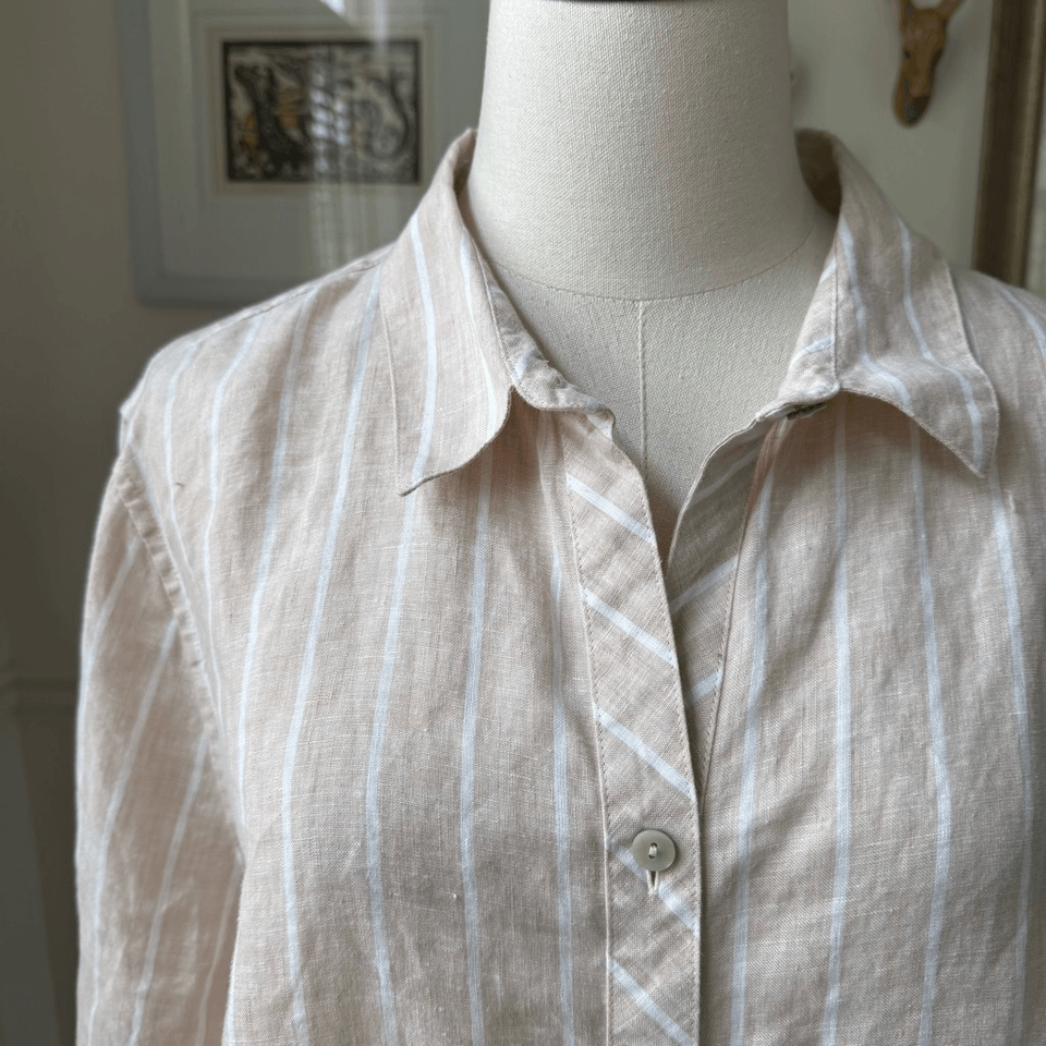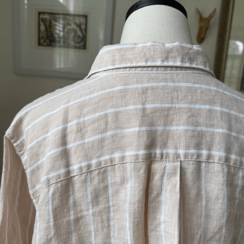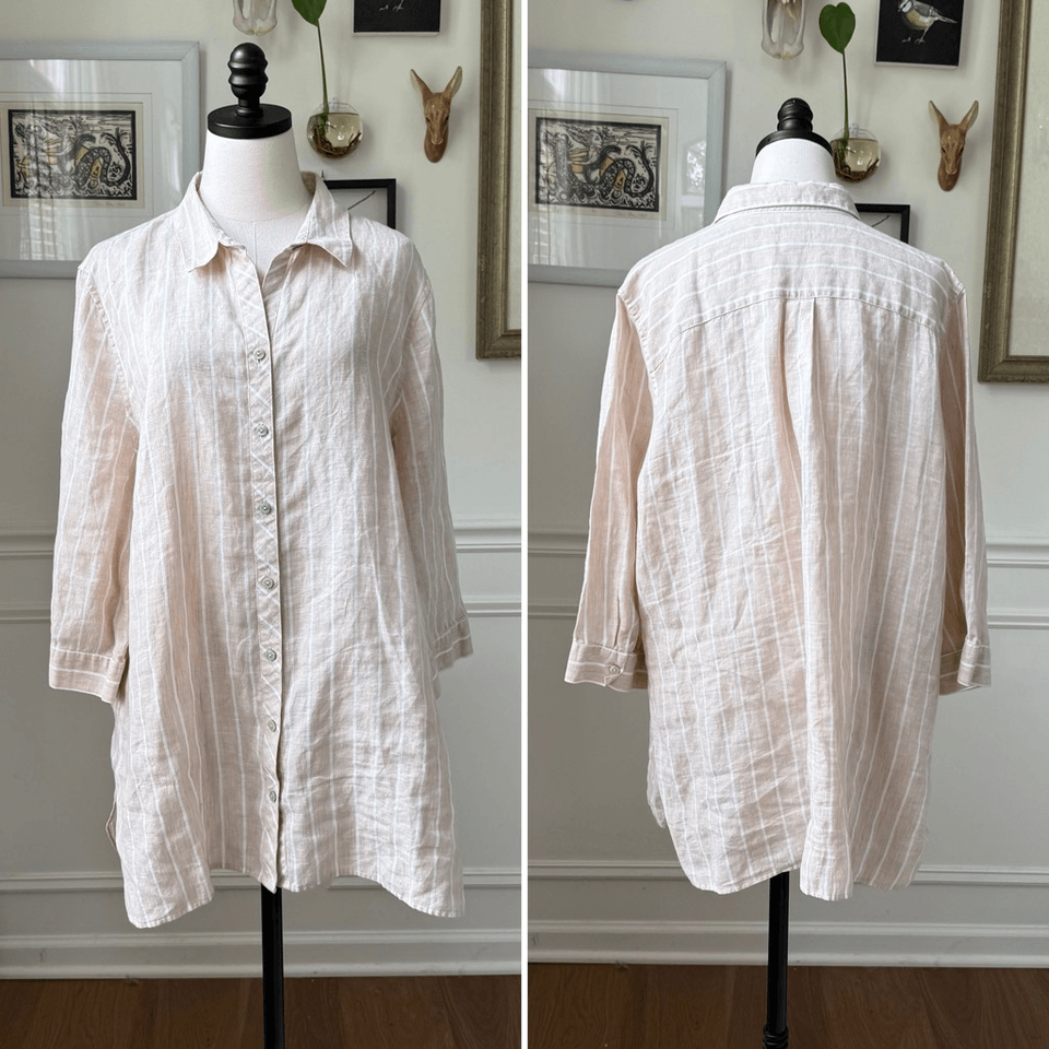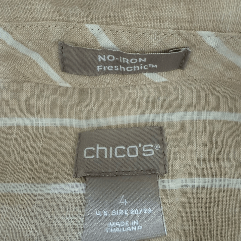 Chico?s 100% linen beige button up tunic with white stripe. Tag size 4, which in Chico sizing is roughly equivalent to a US women?s size 2X 20 to 22. Laying flat measures approximately 31 inches shoulder to hem and 26 inches armpit to armpit