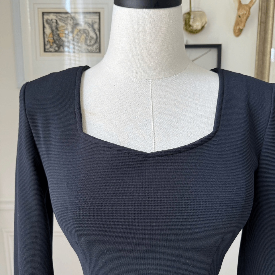 Vintage 80s or 90s Le Chateau solid, black little black dress with square neckline and long sleeves with 4 1/2 inches of caging at the rest for a little visual interest, and a little edge. Polyester and spandex blend horizontal rib that has enough stretch to be comfortable, but the weight of the fabric is heavy enough to smooth out any lumps or bumps you might have. It does have shoulder pads, which give the dress a little structure and could easily be clipped out if you didn?t want that. The shoulder pads make me think 80s Robert Palmer addicted to love, but the style is very 90s to me. The store was all the rage in my area in both decades. Laying flat measures 35 inches shoulder to hem, 16 inches armpit to armpit 12.5 inches straight across the waist and 16 inches across the hip. Tag size 7, but featured on my size medium dress form where it fits well. I think it would fit a small or medium comfortably, but if you are trending towards a large, it may be too small.