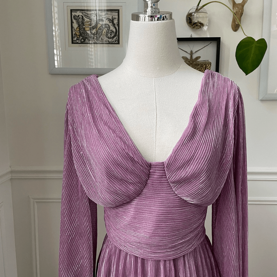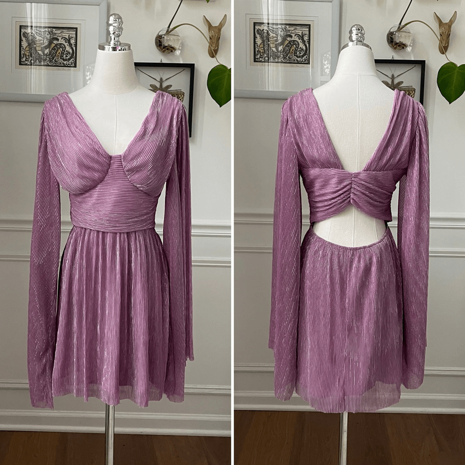 Amy Enjoy Life mauve iris pink Bell sleeve open back mini dress. The bell sleeves are dramatic and flowing. Fitted through the waist before releasing to a short flowing skirt. Lined. Side zip closure. 100% polyester. Tag size XS. Measurements are approximate and taken while laying flat: 33 inches shoulder to him, 13 inches straight across the waist and 17 inches armpit to armpit with darting to accommodate cup size. Feminine date night homecoming.