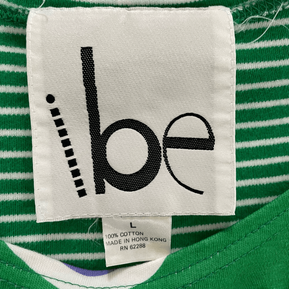 I believe this is 80s based on style and country of manufacture, Be brand green, slightly cropped tank top with white stripes across the back and geometric patterns on the front in multi colors surrounded by white sequin that are a little closer to pailettes but the hole is in the center. 100% cotton and made in Hong Kong. Laying flat measures 22 inches shoulder to hem and 19 inches armpit to armpit. The tag size is large, but based on these measurements and the fact that vintage sizing tends to differ from modern sizing, I think it?s closer to a modern size medium, but please double check measurements to ensure the proper fit for you