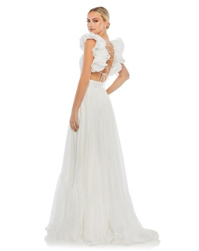 Elegantly situated at the intersection of innocence and allure, this rosette and ruffle-decked gown features a deeply dipped neck and sensual cutout details. A laced-up closure completes the intoxicating look.