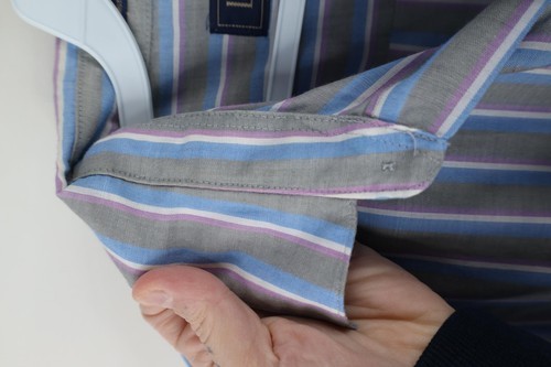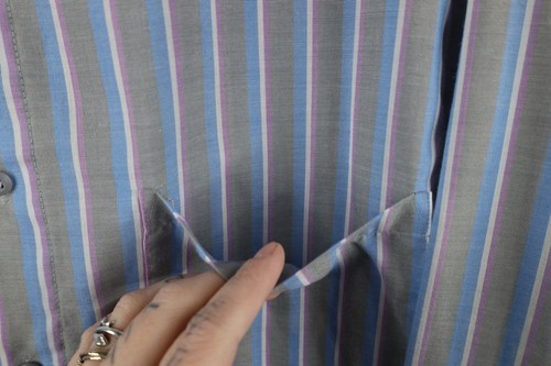 Bottom button replaced, loose threads buttons. Collar, cuffs discolored. Pilling, fabric pulls. Color faded