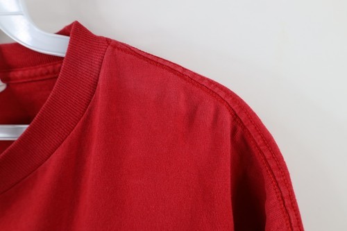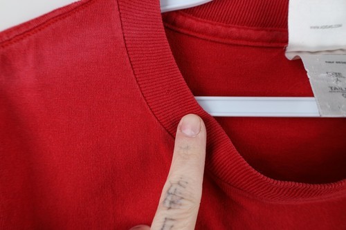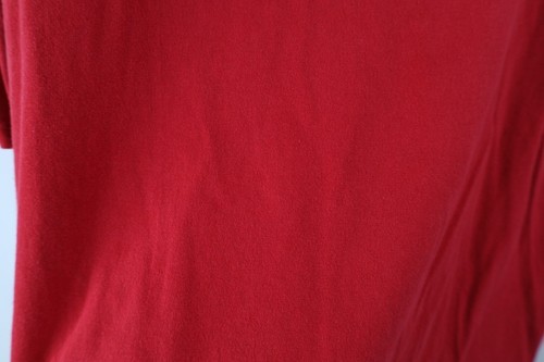 Hole collar. Dark spots front. Collar, shoulders, armpits discolored. Color faded. Pilling