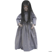 Angry, haunting little girl with dark-circled eyes that fade on and off. Standing 32 inches tall, she is dressed in a dingy gray dress and has poseable arms. She says one of three 9-second phrases with each activation of her motion/light sensor:? "While you stayed away, I could tolerate you. Now that you are here you better be afraid!"? "Crows and maggots picked at my flesh, not fun. It is an experience I hope to share with you."? "Your living happiness sickens me. Hell hath no fury like a little girl scorned."She's a frighteningly fun addition to your home Halloween decorations and a great haunted house prop! Imported.