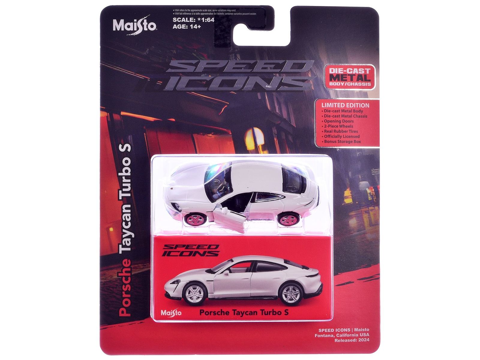 A: This Maisto Porsche Taycan Turbo S comes with a bonus storage box, perfect for keeping it protected and on display.