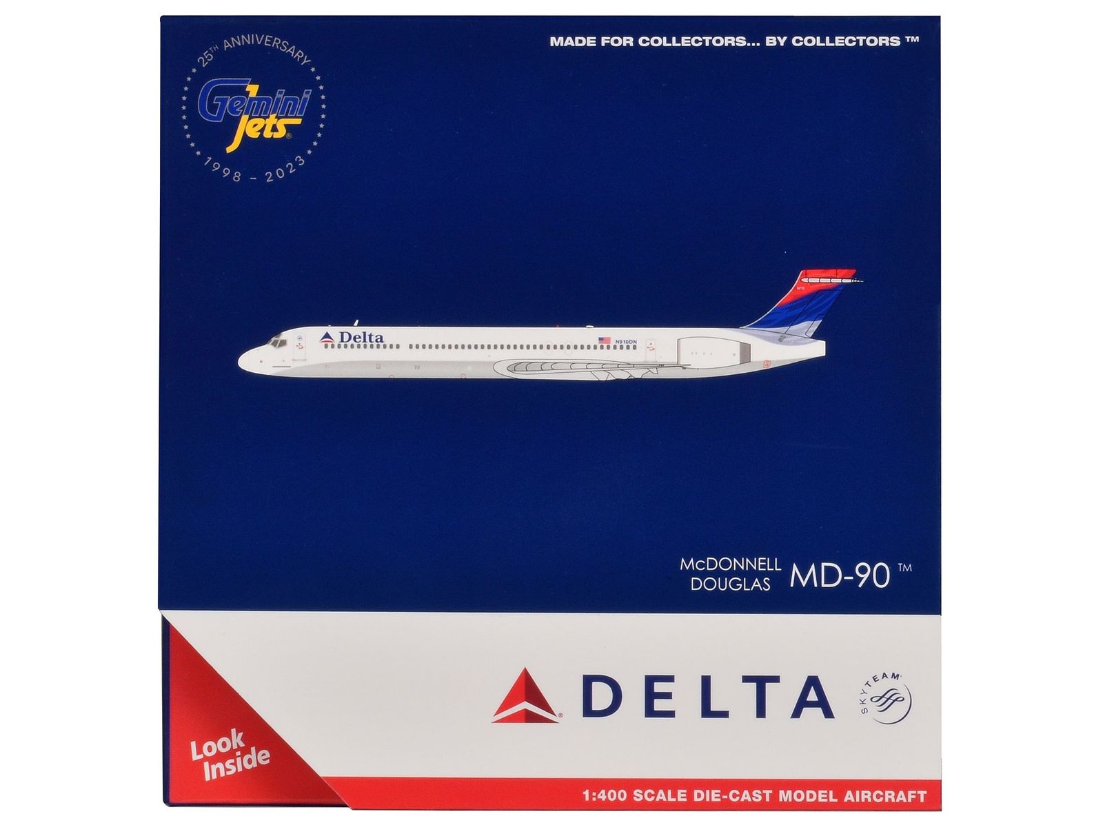 Close your eyes and imagine yourself gazing out an airport window, the crisp air whipping past as you watch a majestic Delta Air Lines MD-90 gracefully taxi to the runway. The sleek white fuselage, adorned with the iconic blue and red "Colors in Motion" tail, cuts through the sunlight, a symbol of adventure and progress. Now, bring that experience home with this meticulously crafted 1/400 scale diecast model of Delta Air Lines' N910DN.