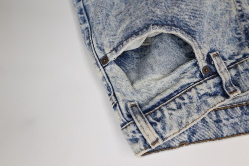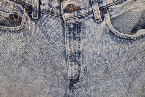Threadbare spot upper back. Blemishes front and back. Distressing around waist, pockets and cuffs. Threadbare spot right knee. USA made