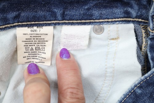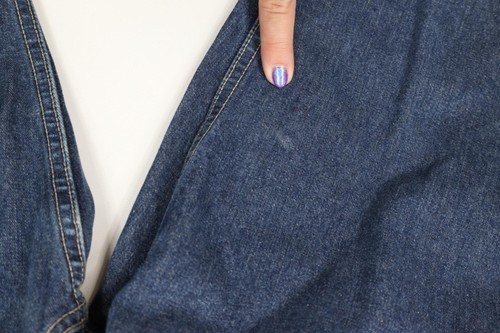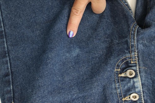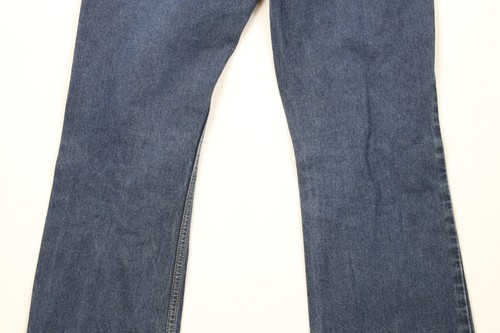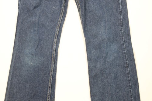 Threadbare spot right leg. Blemishes front and back. Cuffs ripped