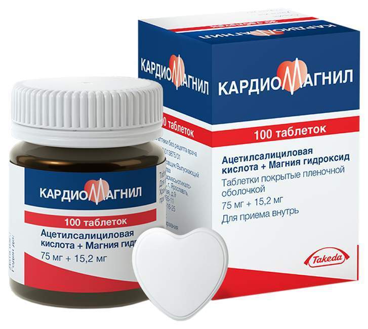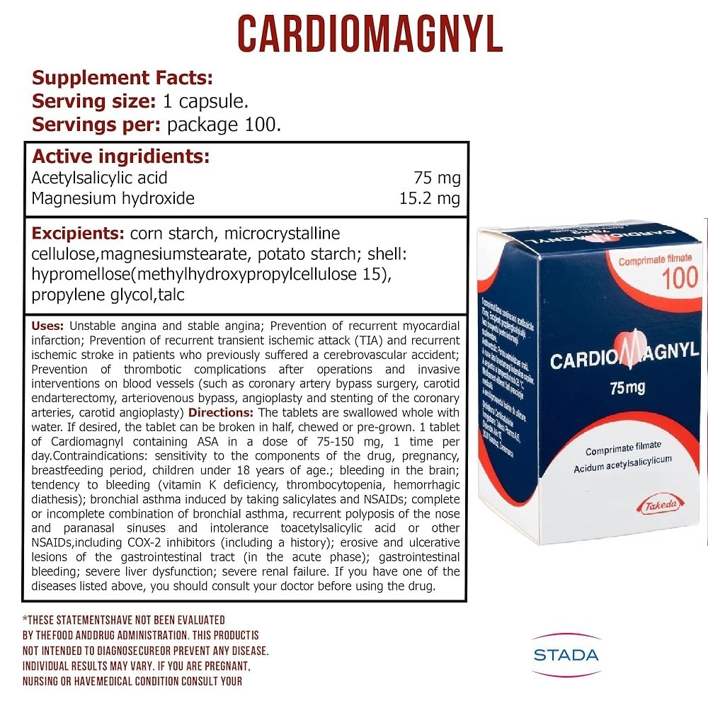 The tablets are swallowed whole with water. If desired, the tablet can be broken in half, chewed or pre-ground. Primary prevention of cardiovascular diseases such as thrombosis and acute heart failure in the presence of risk factors (for example, diabetes mellitus, hyperlipidemia, arterial hypertension, obesity, smoking, old age) 1 tablet of Cardiomagnyl containing ASA at a dose of 150 mg on the first day, then 1 tablet of Cardiomagnyl containing ASA at a dose of 75 mg 1 time per day. Prevention of recurrent myocardial infarction and blood vessel thrombosis 1 tablet of Cardiomagnyl containing ASA at a dose of 75-150 mg 1 time per day. Prevention of thromboembolism after vascular surgery (coronary artery bypass grafting, percutaneous transluminal coronary angioplasty) 1 tablet of Cardiomagnyl containing ASA at a dose of 75-150 mg once a day. Unstable angina pectoris 1 tablet of Cardiomagnyl containing ASA at a dose of 75-150 mg once a day.